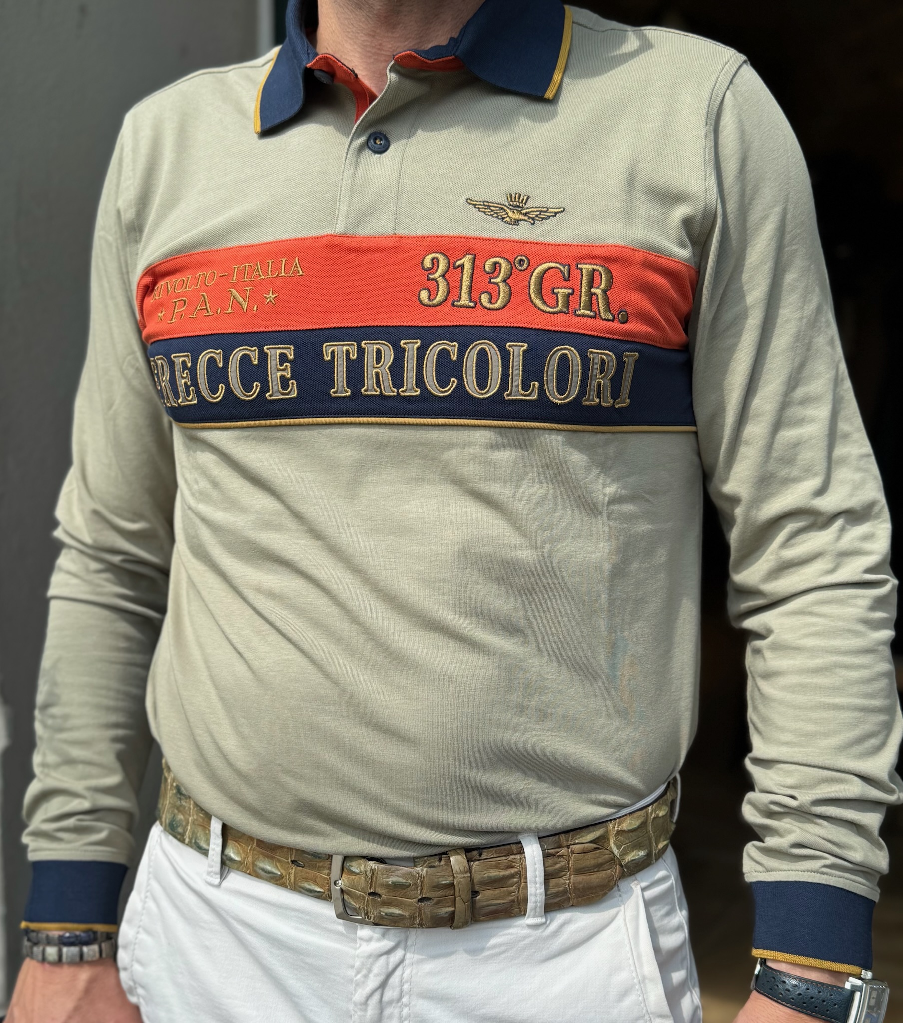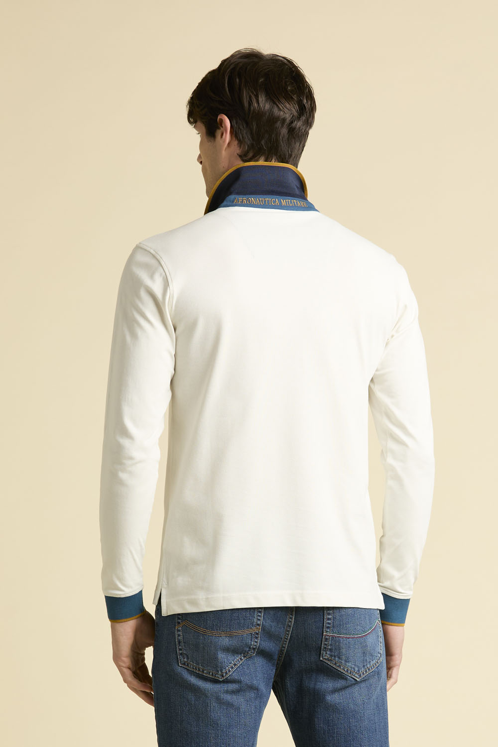 Super fed langærmet polo fra Aeronautica. Poloen er ensfarvet, med blå badges på fronten og broderede detaljer. Poloen fåes i hvid og beige.
