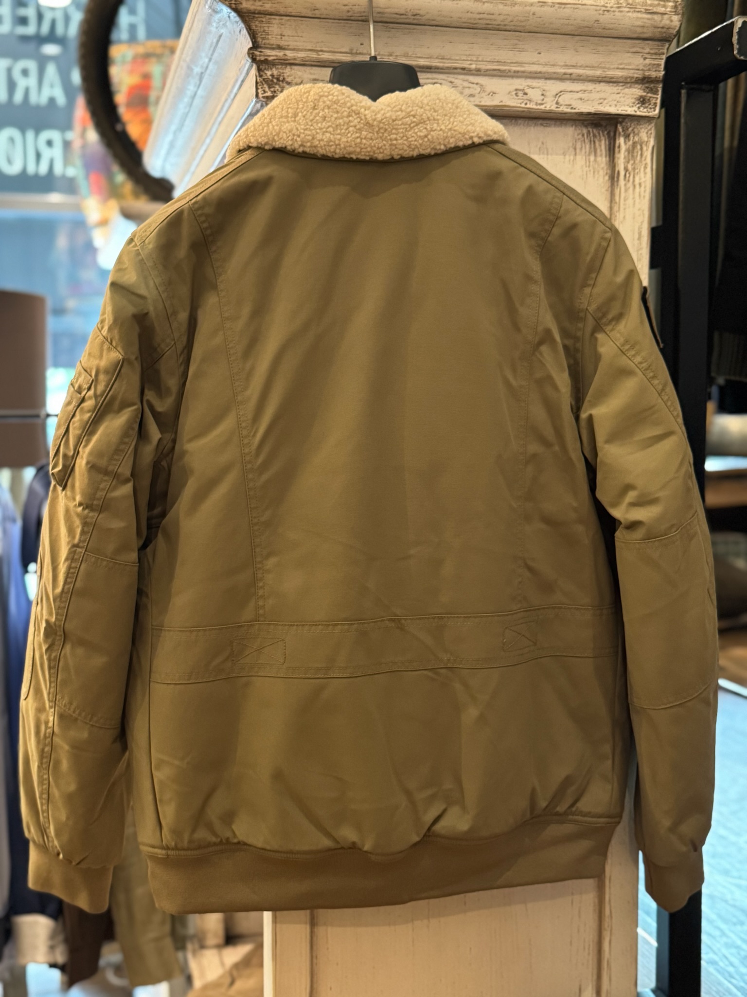 Top fed jakke fra Aeronautica Militare. Denne jakke er khaki farvet og har et cool bomber jacket look. Jakken er godt foret, så den sikrer dig varme på de kolde vinterdage. Jakkens krave er lavet af faux lammeuld og er ellers udstyret med velcro badges. Jakken har elastik forneden, som gør den fleksibel og behagelig. Jakken har både brystlomme, dobbelte forlommer og brugbare indelommer.