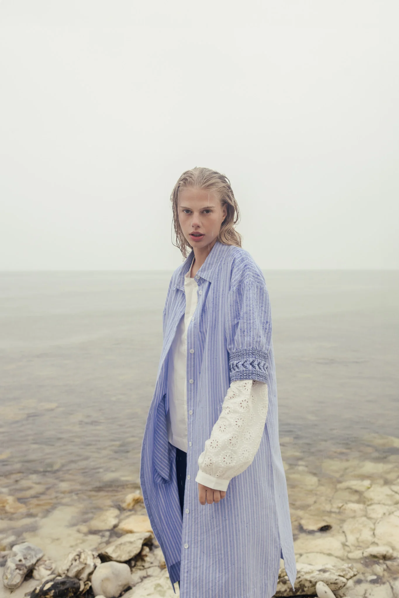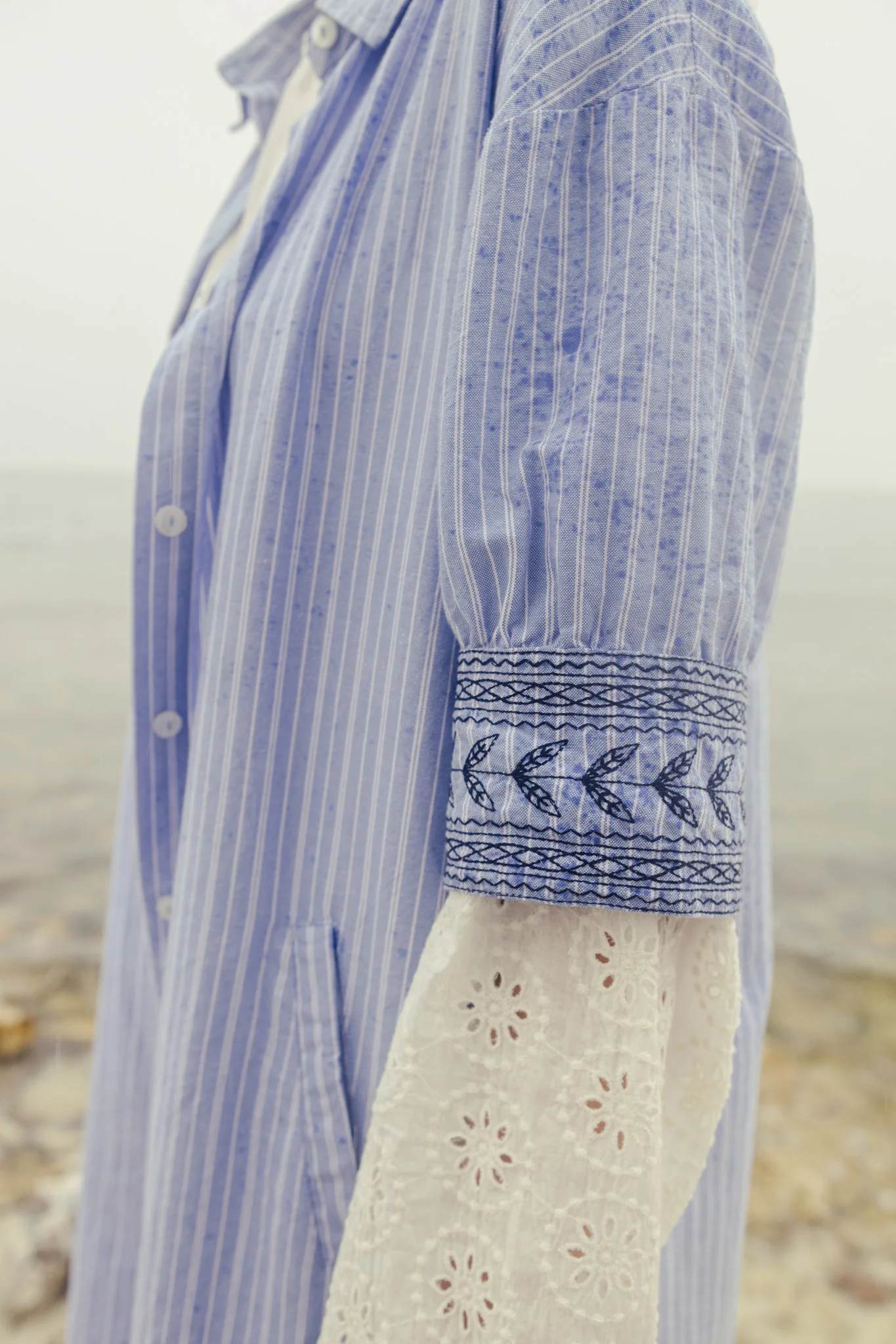 Super flot tunika fra Agenda. Tunikaen er lyse blå, med fine broderede detaljer på ærmerne. Tunikaen har 3/4 ærmer, samt sidelommer og knaplukning foran.