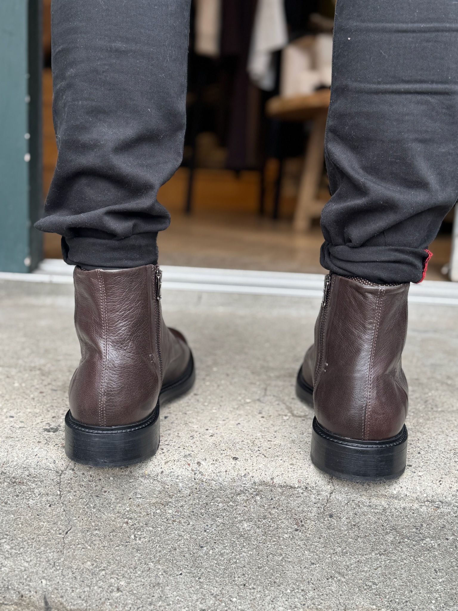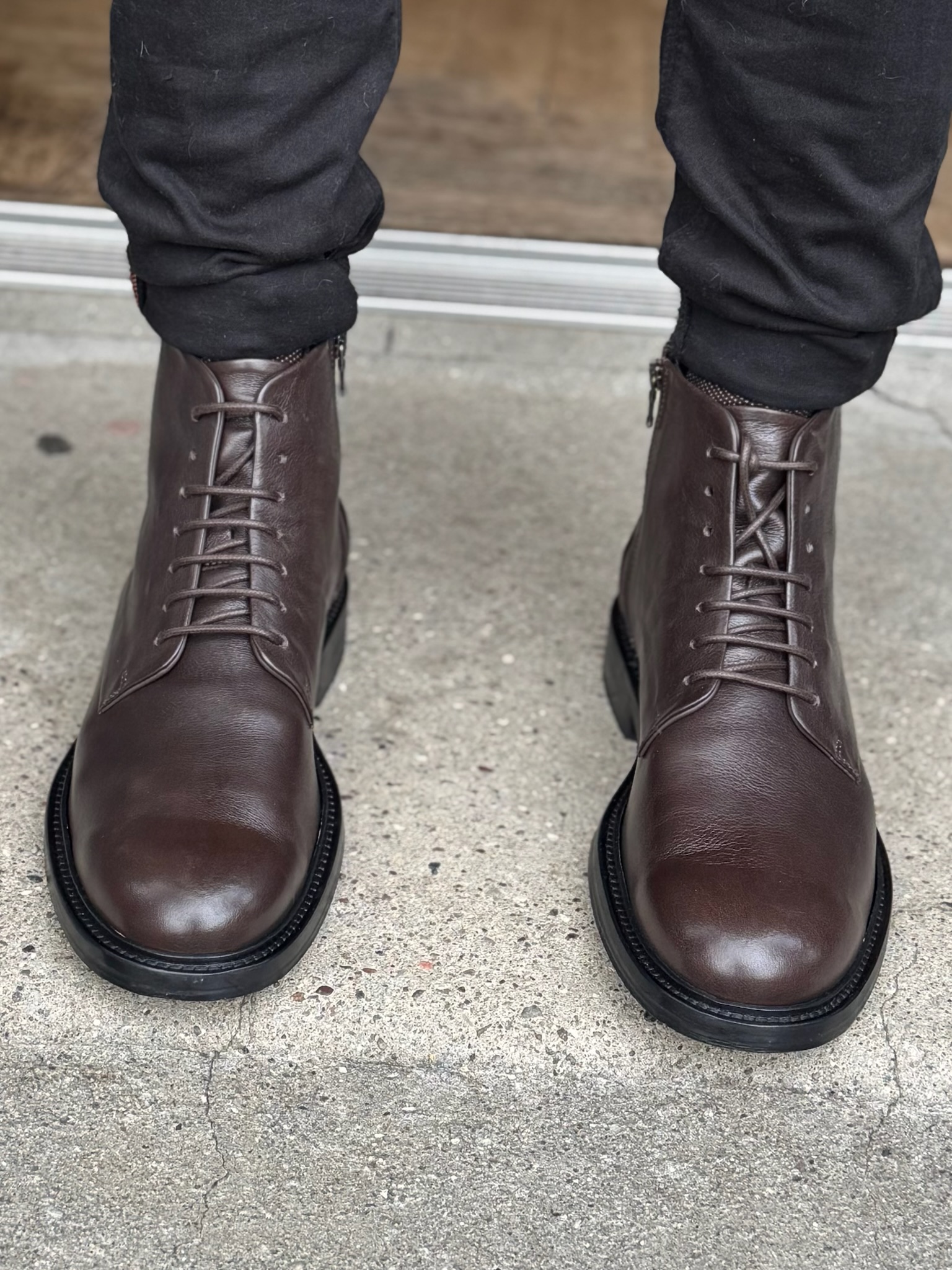 Meget fede skind støvler fra Antica Cuoieria. Støvlerne er brune, med snørerbånd og lynlås i siden. Støvlerne har sort sål og et ankel langt skaft.