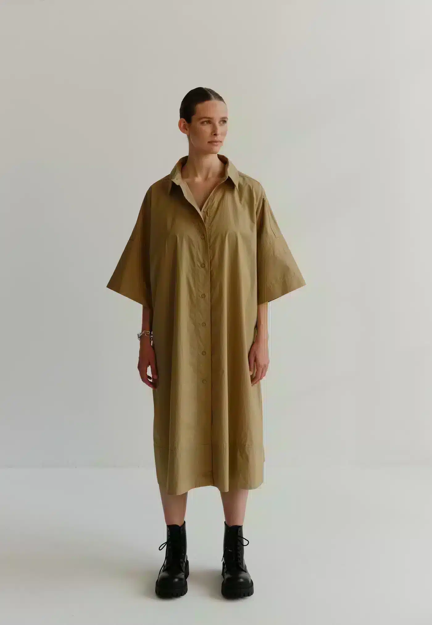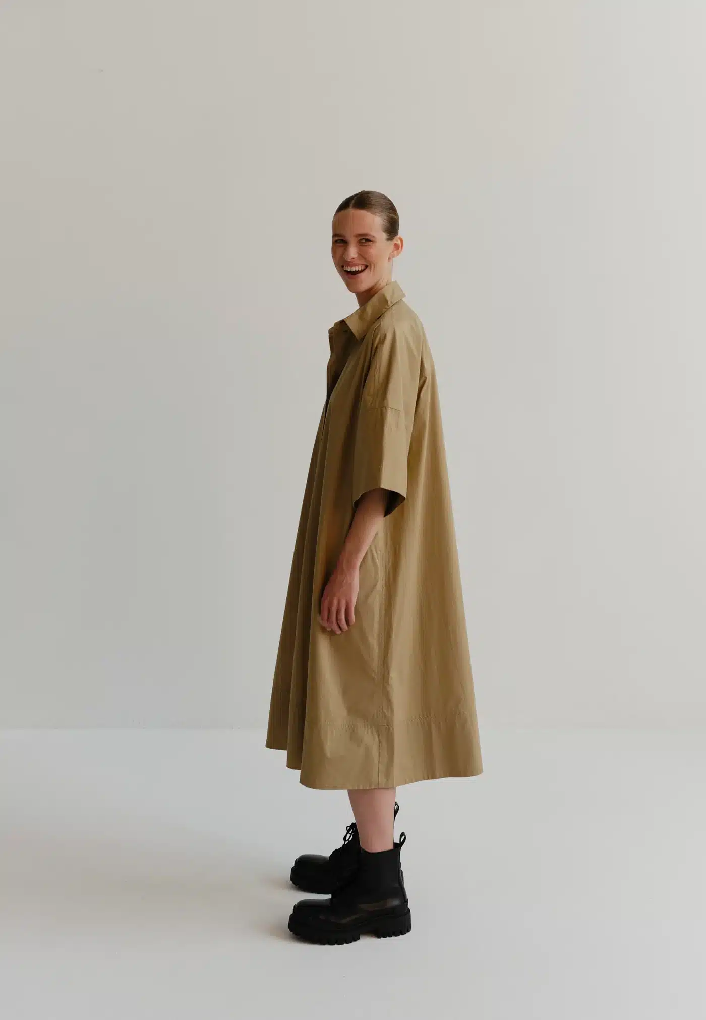 Skønneste a-formede kjole fra Birgitte Herskind. Skjortekjolen har knapper foran og sidelommer. Kjolen er designet til at have et loose og oversized fit.