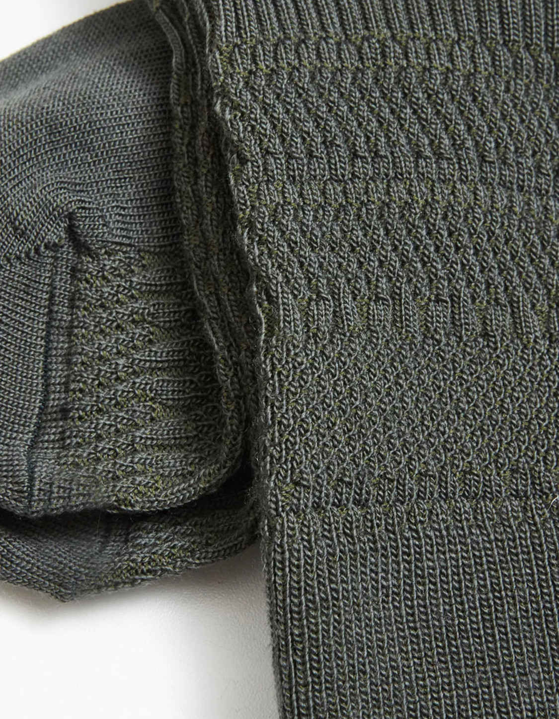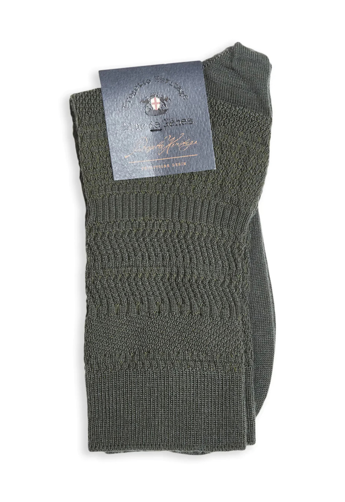 Strømper fra Blue de Gênes i farven grøn/oliven. Strømperne kan absorbere en høj mængde fugt, før de begynder at føles våde og er desuden anti-bakterielle.