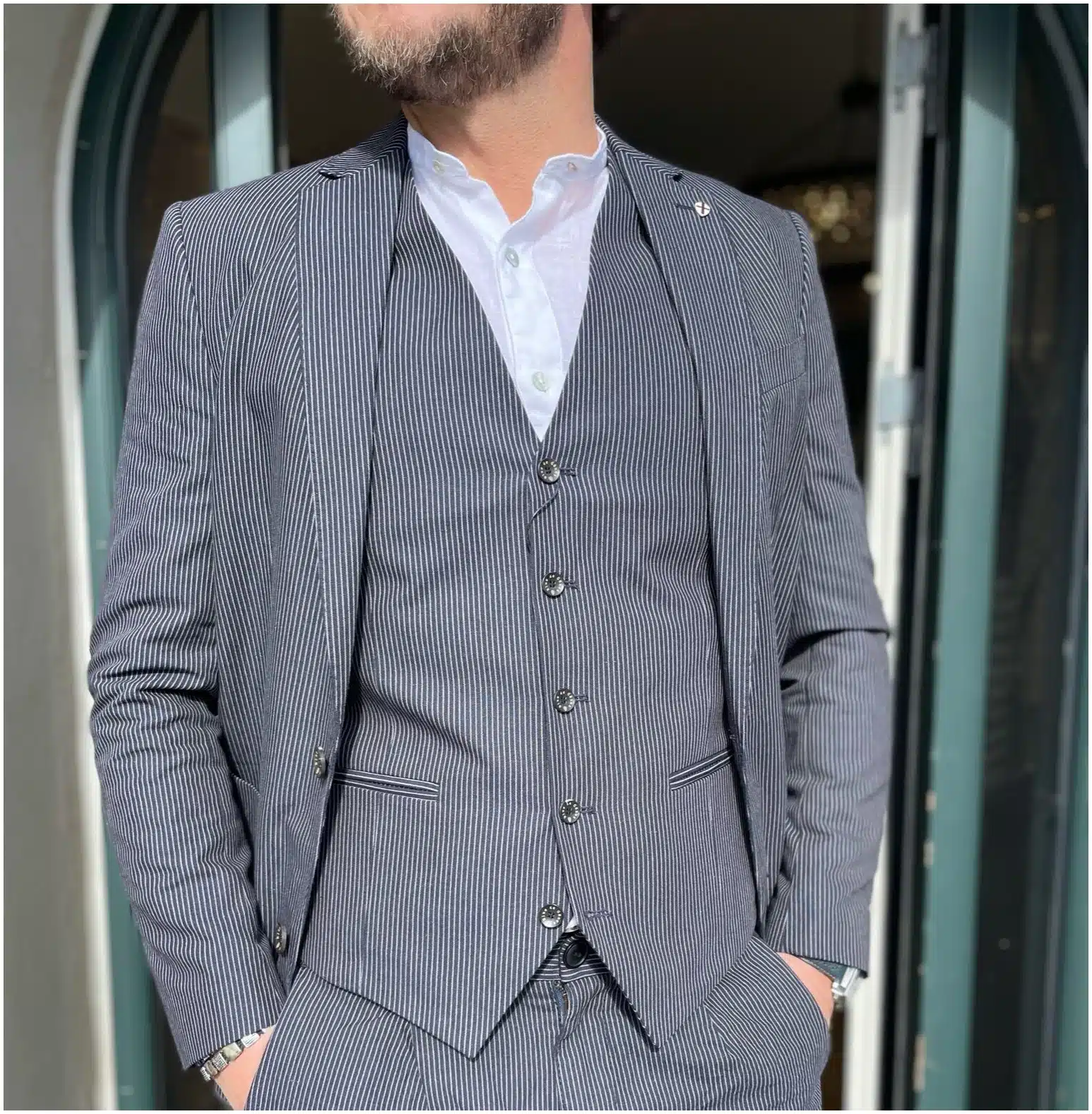 Lækreste blazer fra Blue de Gênes i navy striber. Blazeren kan fåes med matchende bukser og vest i de navy striber.
