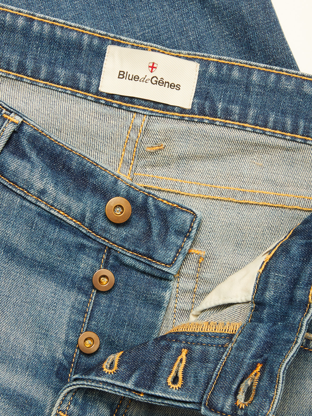 Top fede jeans fra Blue de Gênes. Disse jeans er vasket denim lyseblå, med små detaljer af slid. Disse jeans har knaplukning og god stretch, samt bæltestropper.
