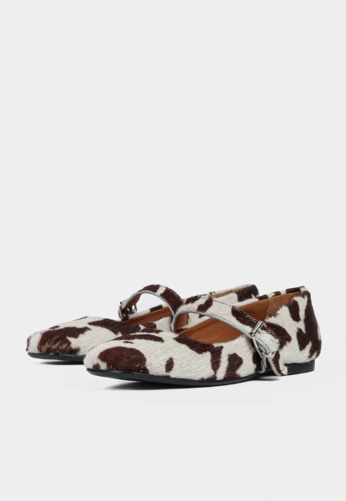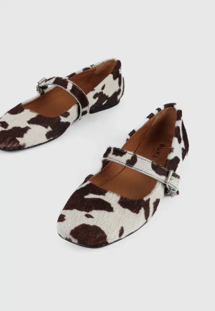 Meget flot ballerina fra Bukela. Ballerinaen er lavet i et flot og opsigtvækkende print, nemlig ko-printet. Ballerinaen er en åben sko, med spænde henover foden og med rund snude. Denne sko har et rå og vovet udtryk, skabt til at gøre indtryk. Et must-have til den modebevidste..