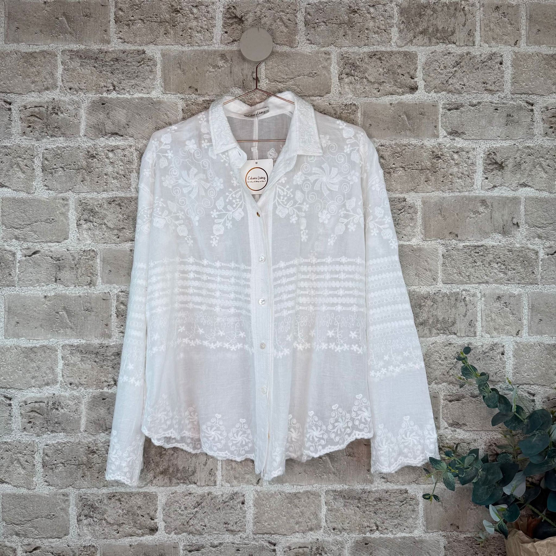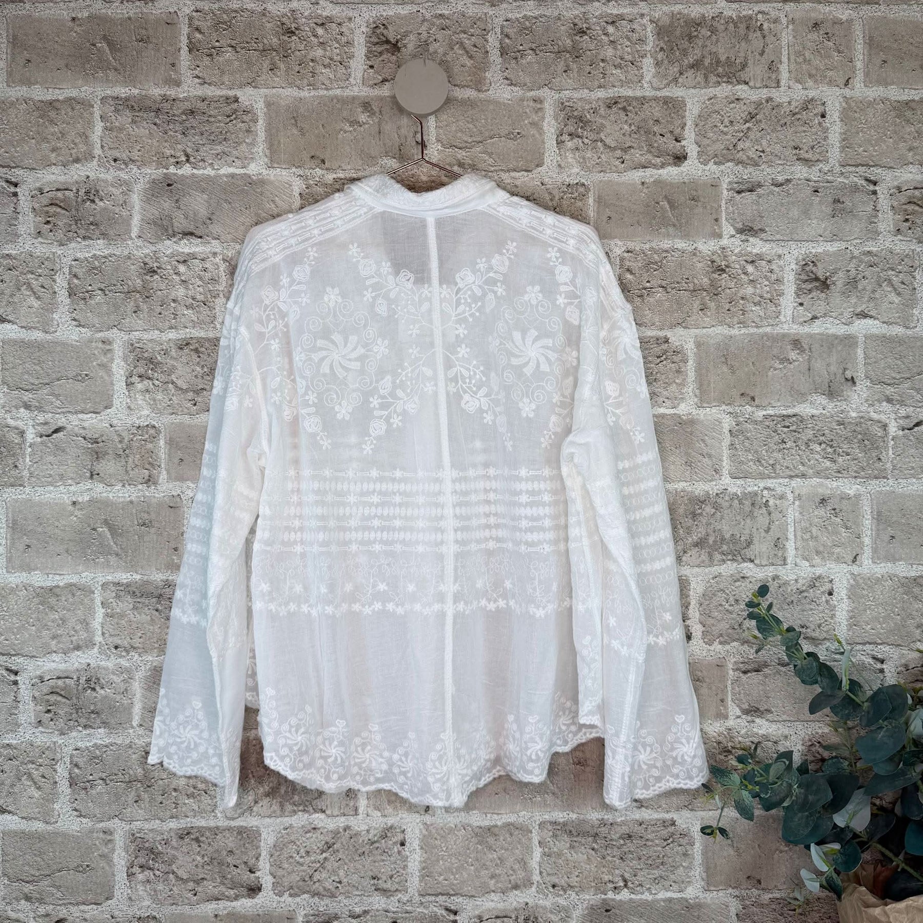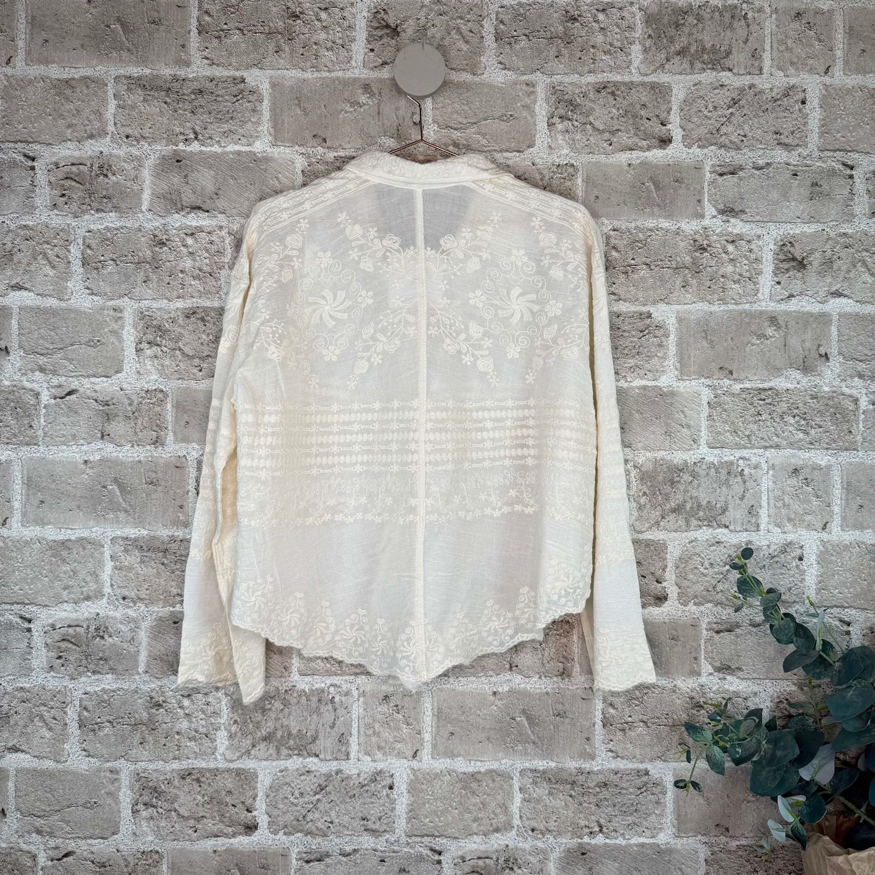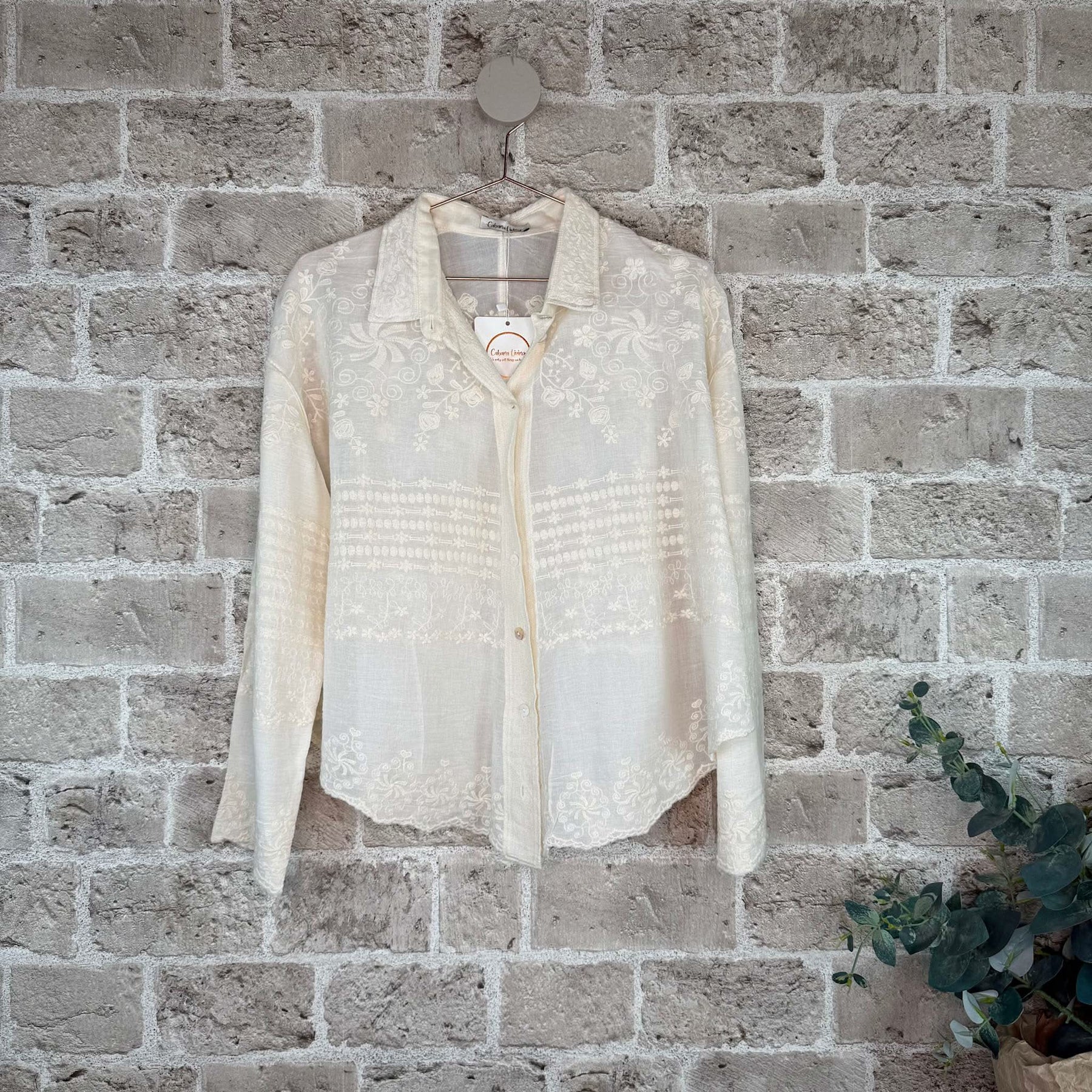 Lækker og let blonde skjorte fra Cabana Living. Skjorten fåes i beige og hvid og er dekoreret med fine broderede blomster blonder. Skjorten er onesize.