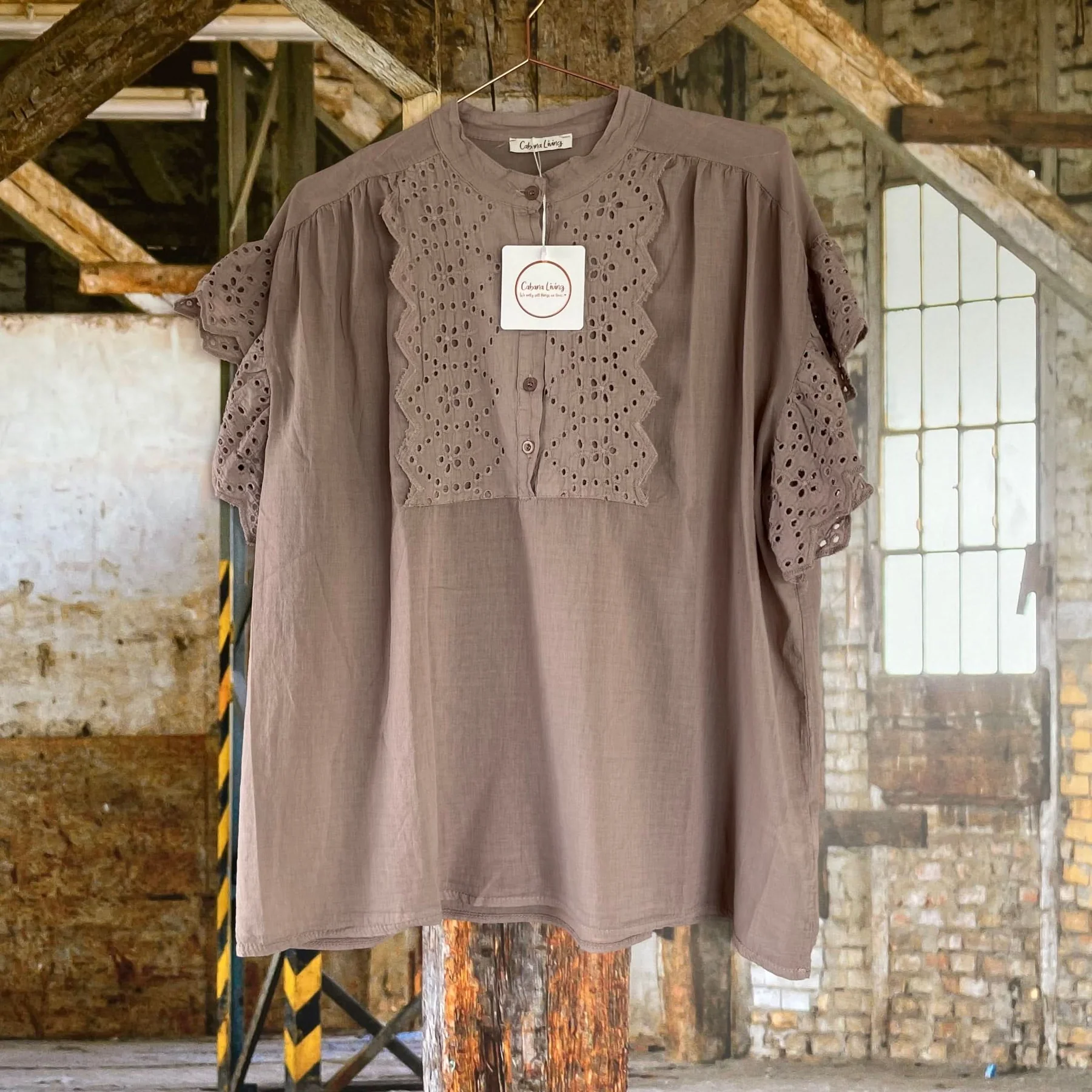 Smuk bluse fra Cabana Living. Blusen er i farven ‘burro’ og har fine broderie anglaise detaljer på ærmer og og front. Blusen har halv knaplukning øverst og et let og luftigt fit.