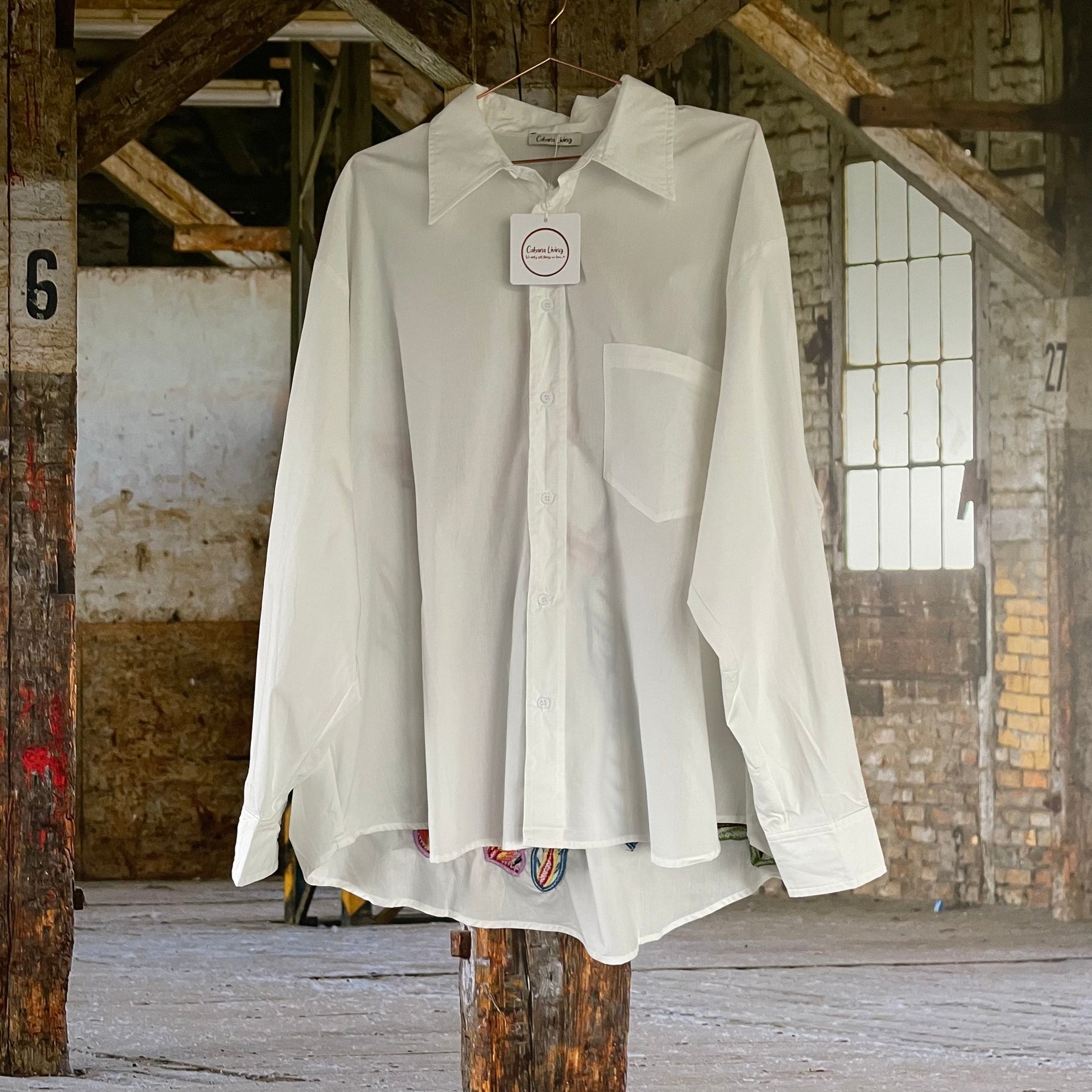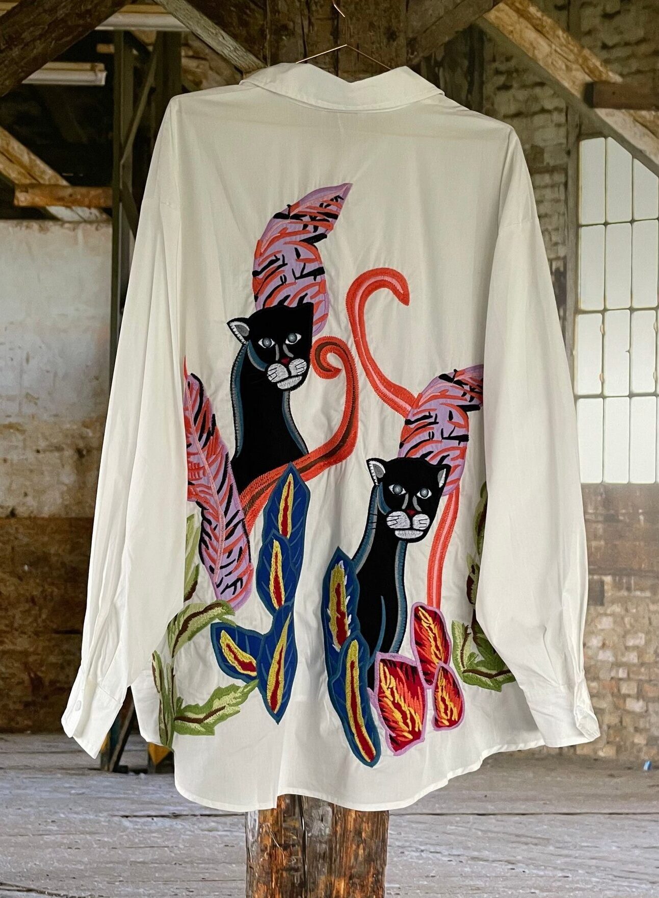 Flot, oversized skjorte fra Cabana Living. Skjorten er hvid, med farverigt katte motiv bagpå. Skjorten har knaplukning foran, samt en brystlomme.