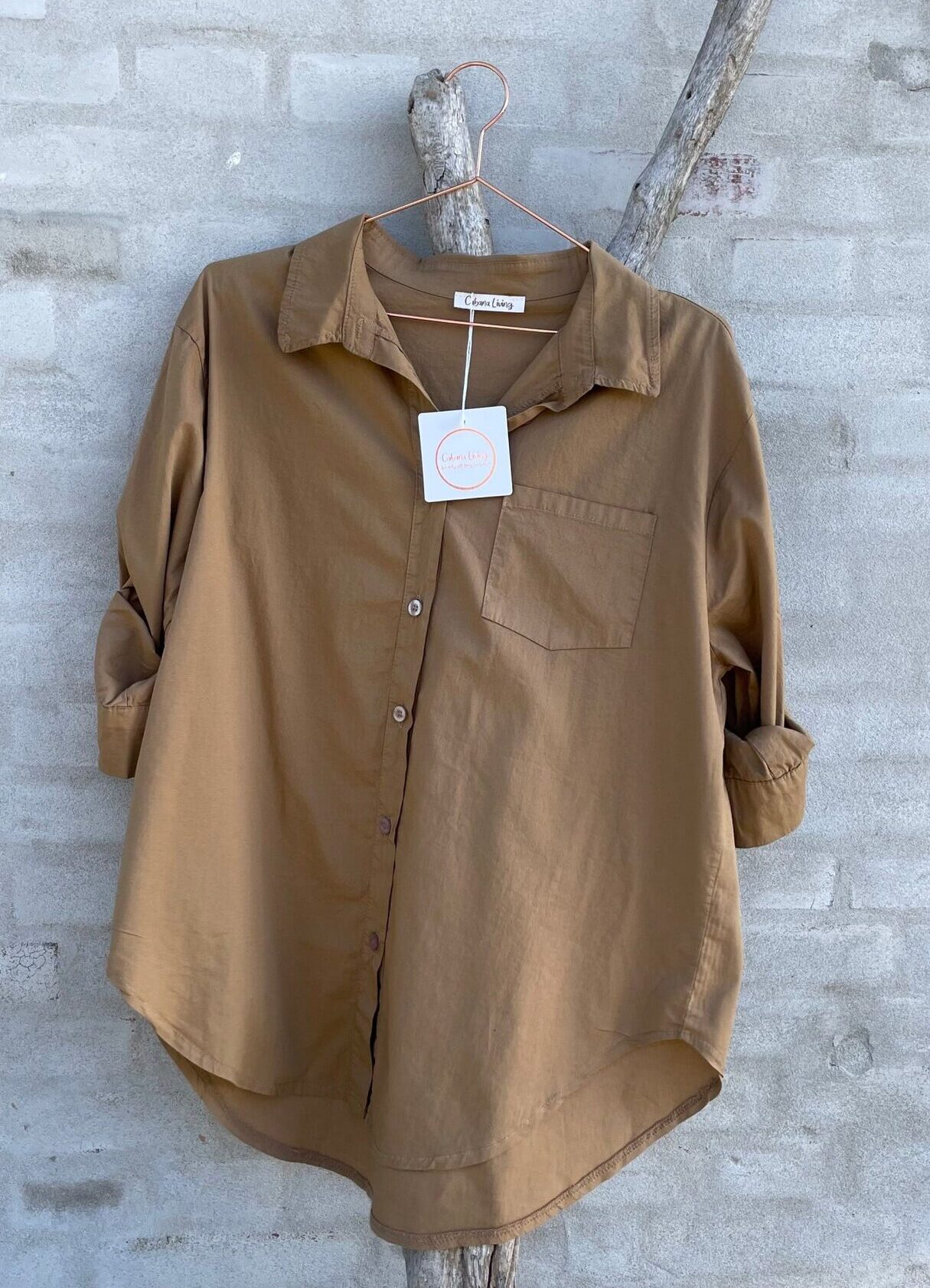 Lækker skjorte fra Cabana Living i camel. Skjorten har knaplukning foran og en brystlomme. Skjorten er onesize.
