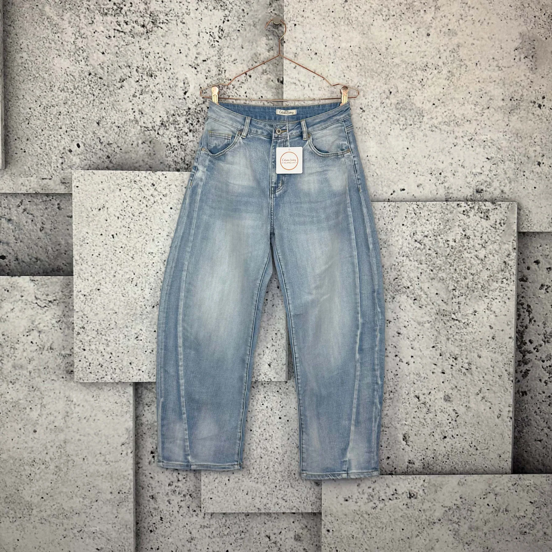Top fed jeans fra Cabana Living, I en flot lys denim. Disse jeans har barell-looket, med volumen i buksebenene. Disse jeans lukkes med knap og lynlås og er lavet i en let, lækker kvalitet.