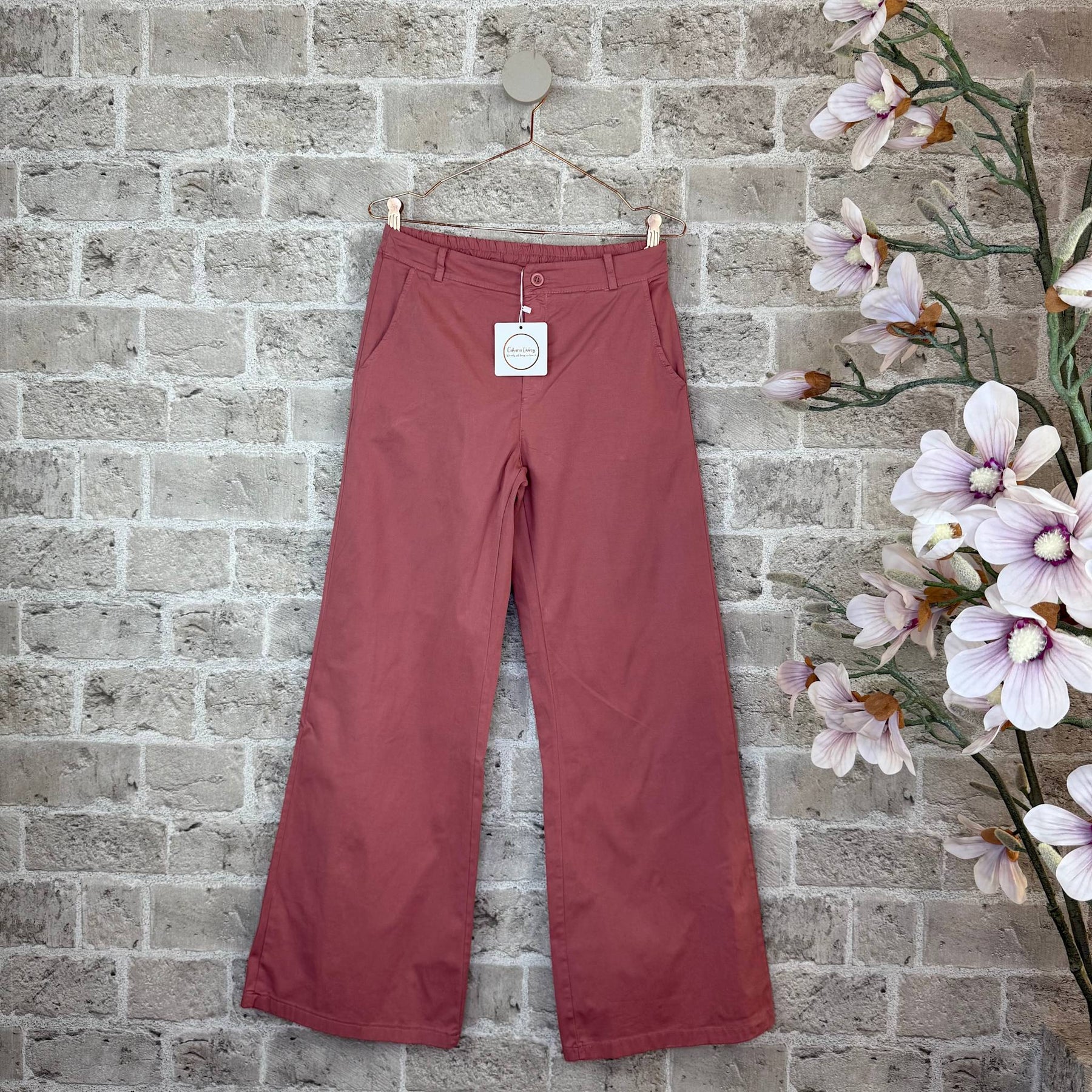 Lækre bukser fra Cabana Living. Bukserne har elastik i taljen og lange, lige ben. Bukserne lukkes med knap og lynlås. Buksen har sidelommer og fåes i 2 farver, Pink Pepper og Tane.