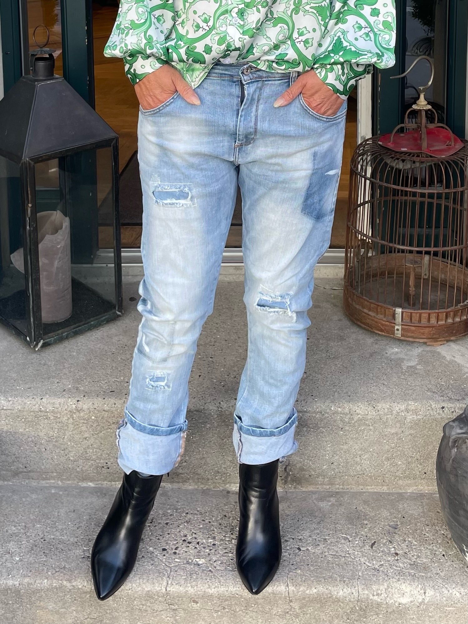 Fede jeans fra Cabana Living. Disse jeans er i en lys denim og har slid rundt omkring på buksen. Denne jeans er stretchy.