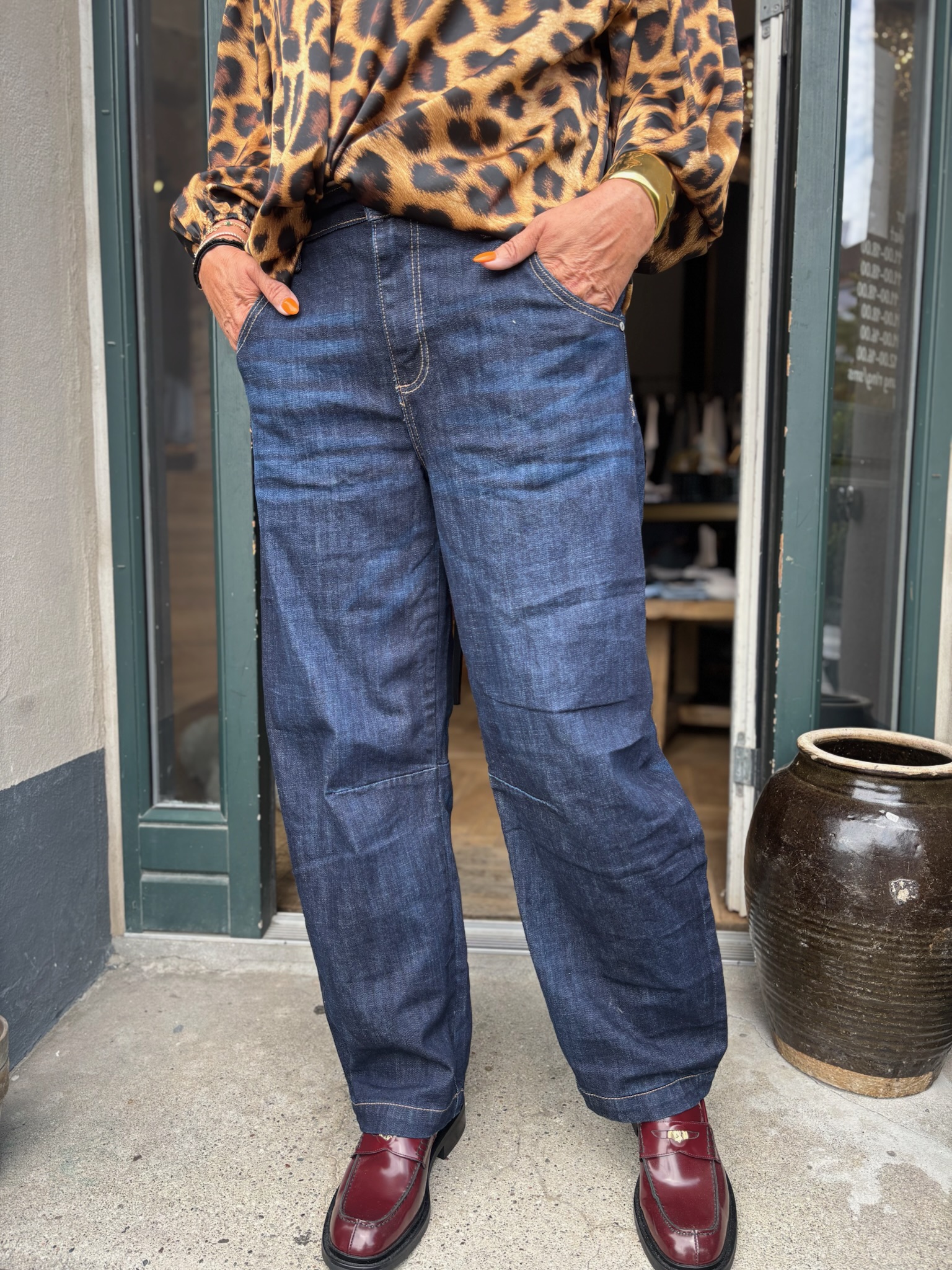 Top fede mørkeblå jeans fra Cabana Living. Disse jeans har lige ben med en lækker løs pasform. Bukserne lukkes med knap og lynlås og er i en mørkeblå vask.