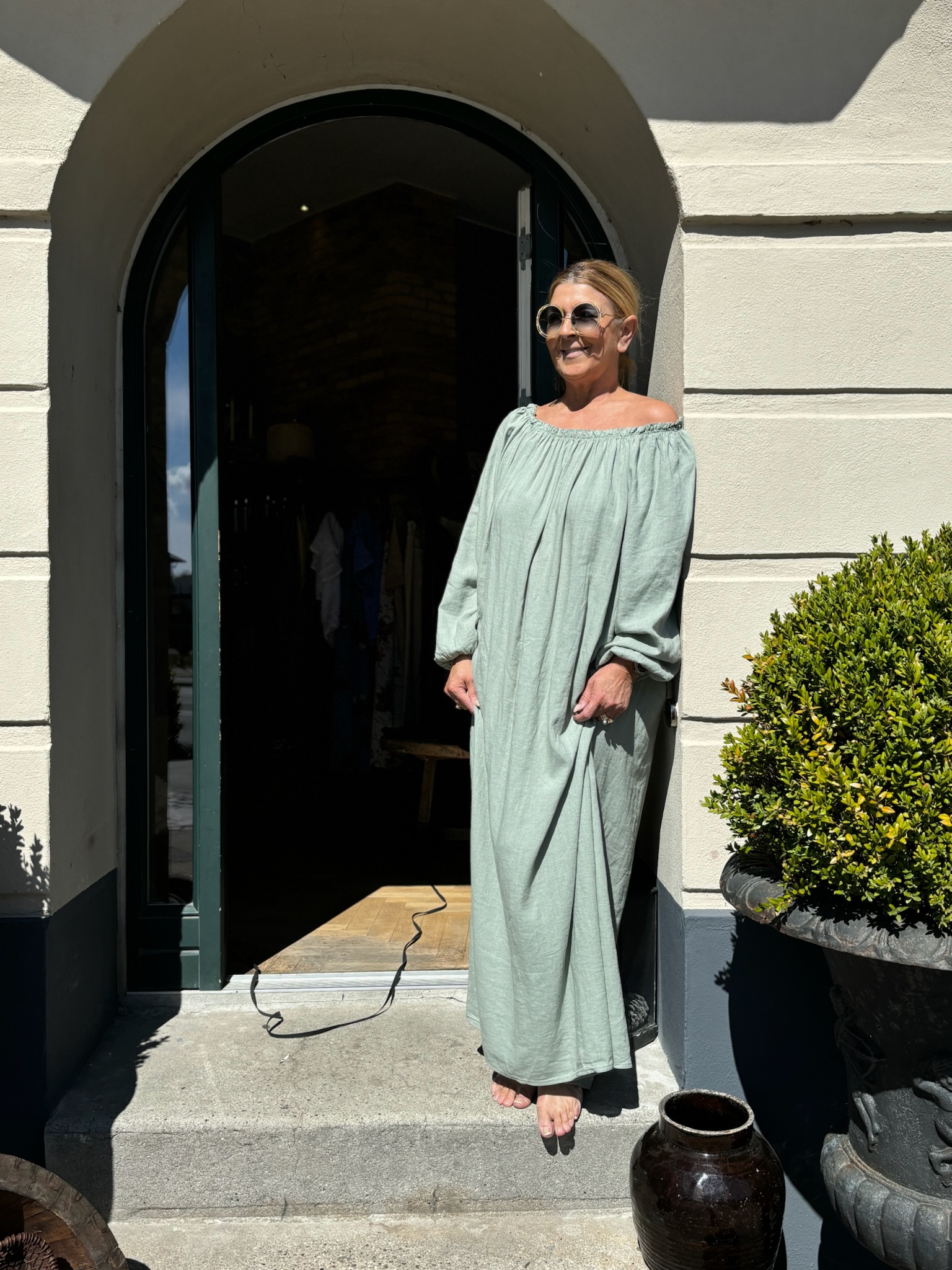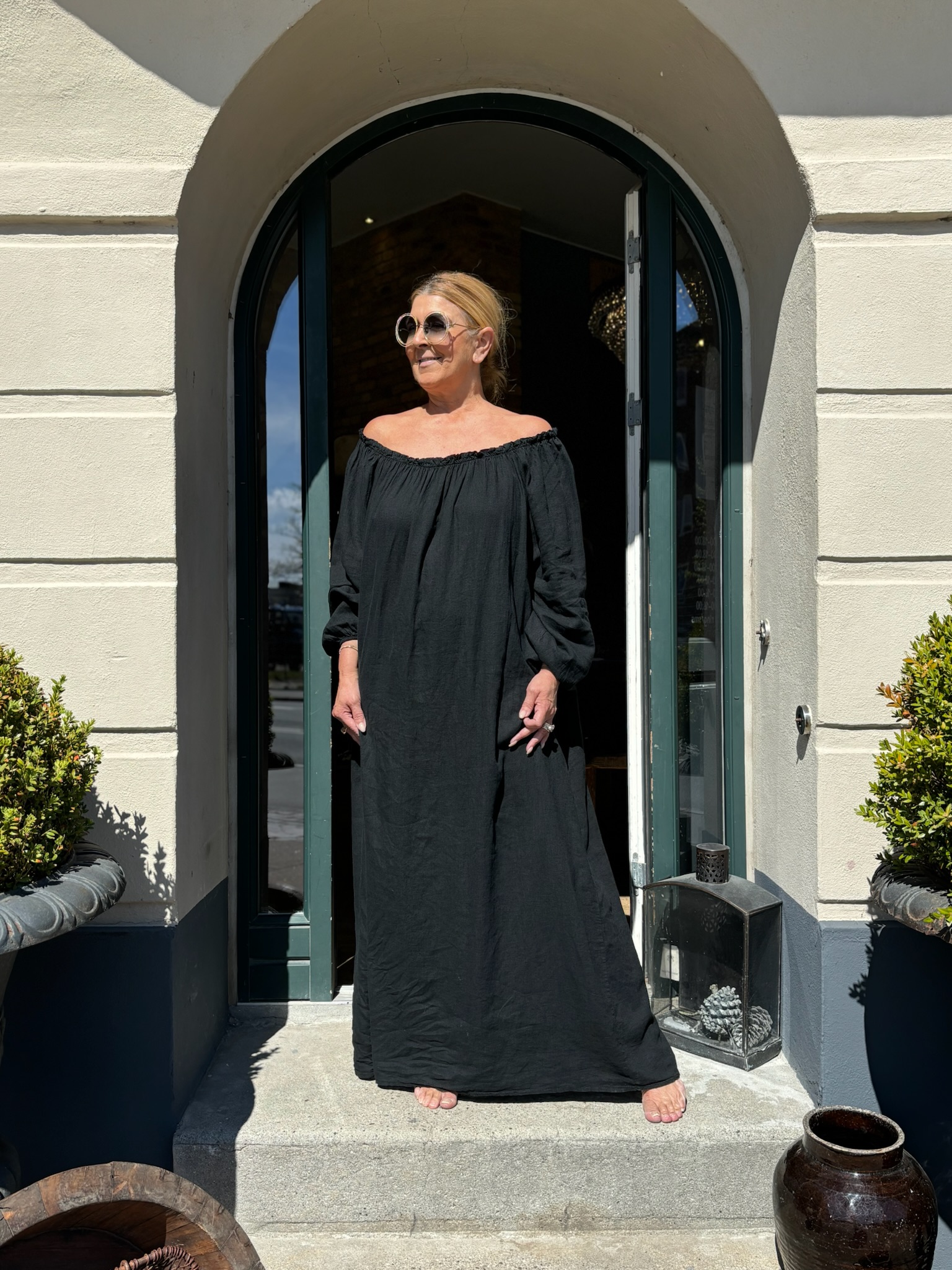Super smuk, lang kjole fra Cabana Living. Kjolen er lavet i en blød, hør/viskose kvalitet og i ‘off-shoulder’ design med elastik ved skuldrene. Kjolen har lange ærmer og er gulvlang – Elisabeth er 170 cm høj.