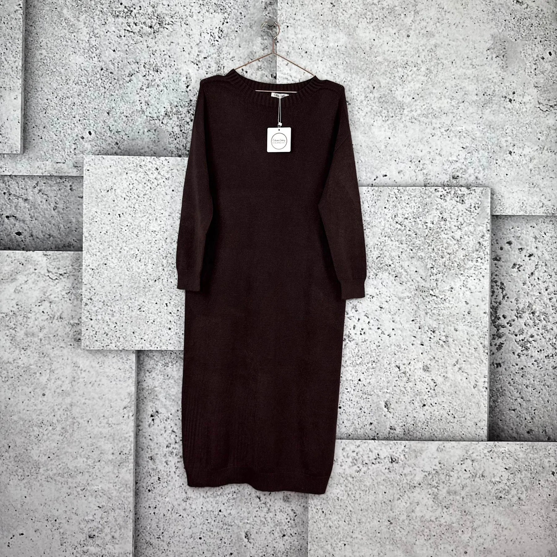 Flot strik kjole fra Cabana Living. Kjolen er chokolade brun, med rund hals-udskæring og lange ærmer.