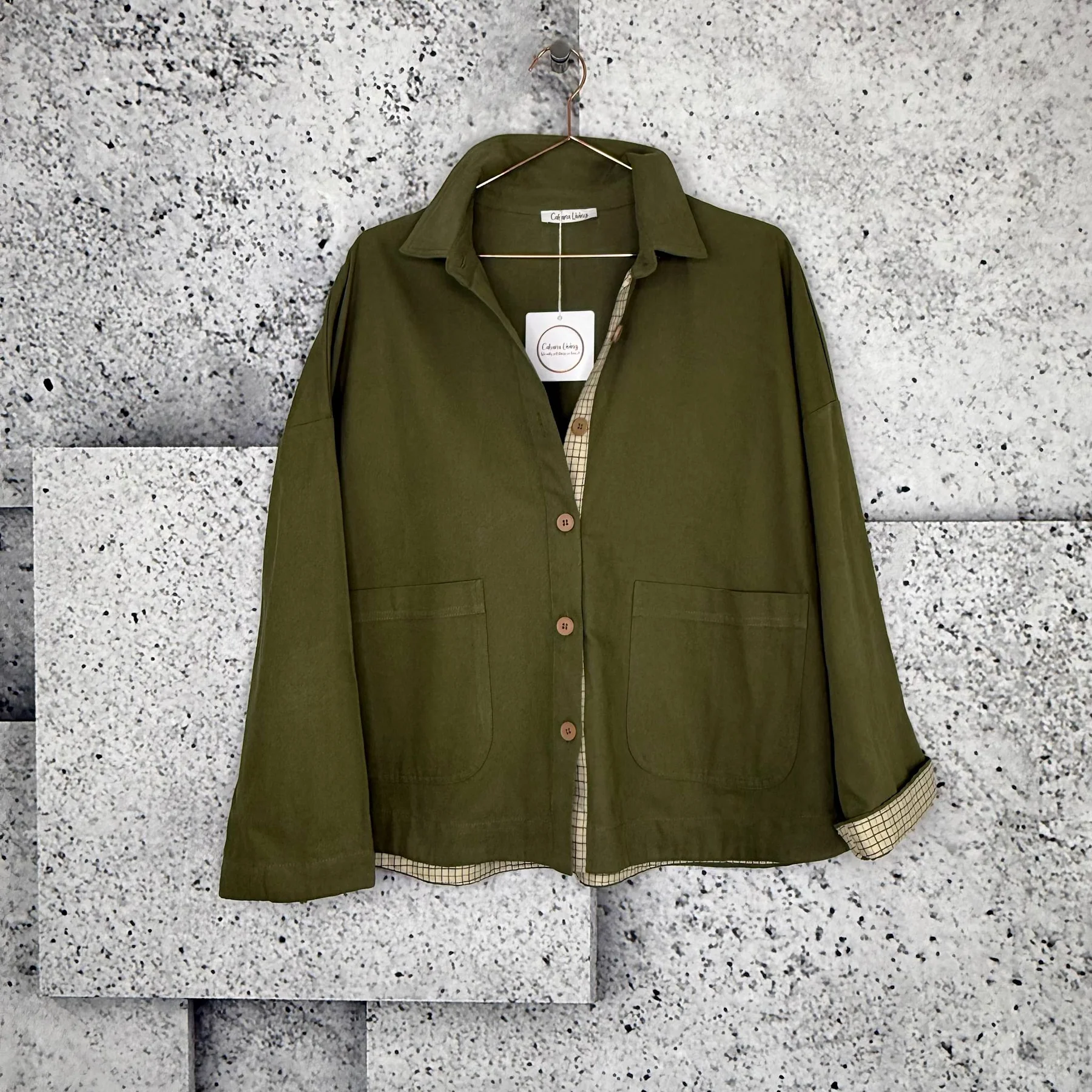 Lækker og blød jakke fra Cabana Living, som fås i camel og army. Jakken har knaplukning foran, 2 forlommer og almindelig krave.