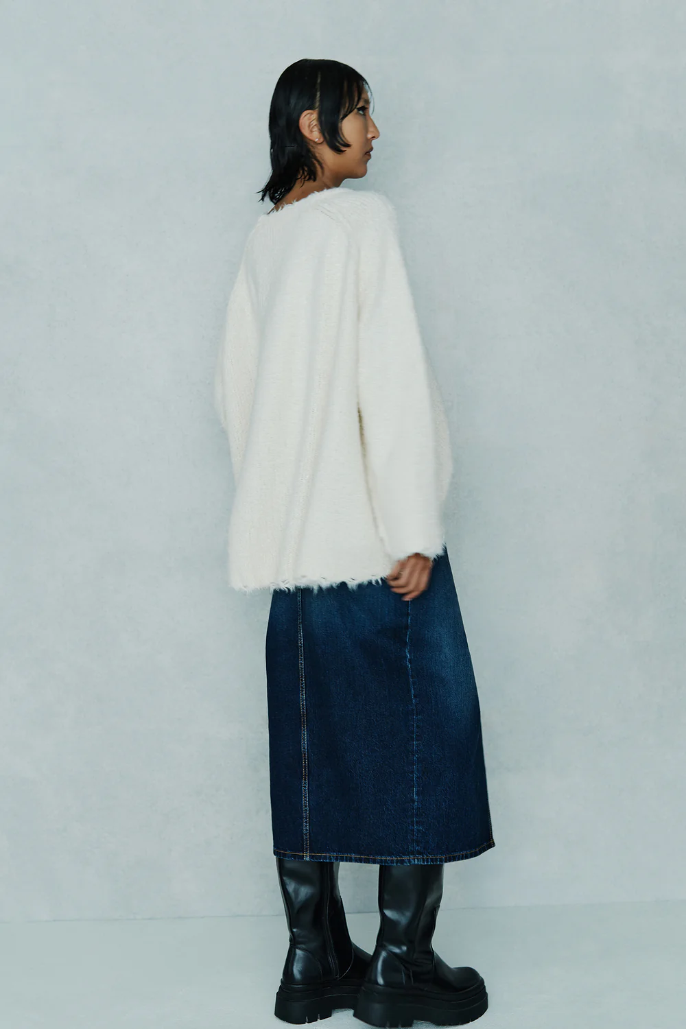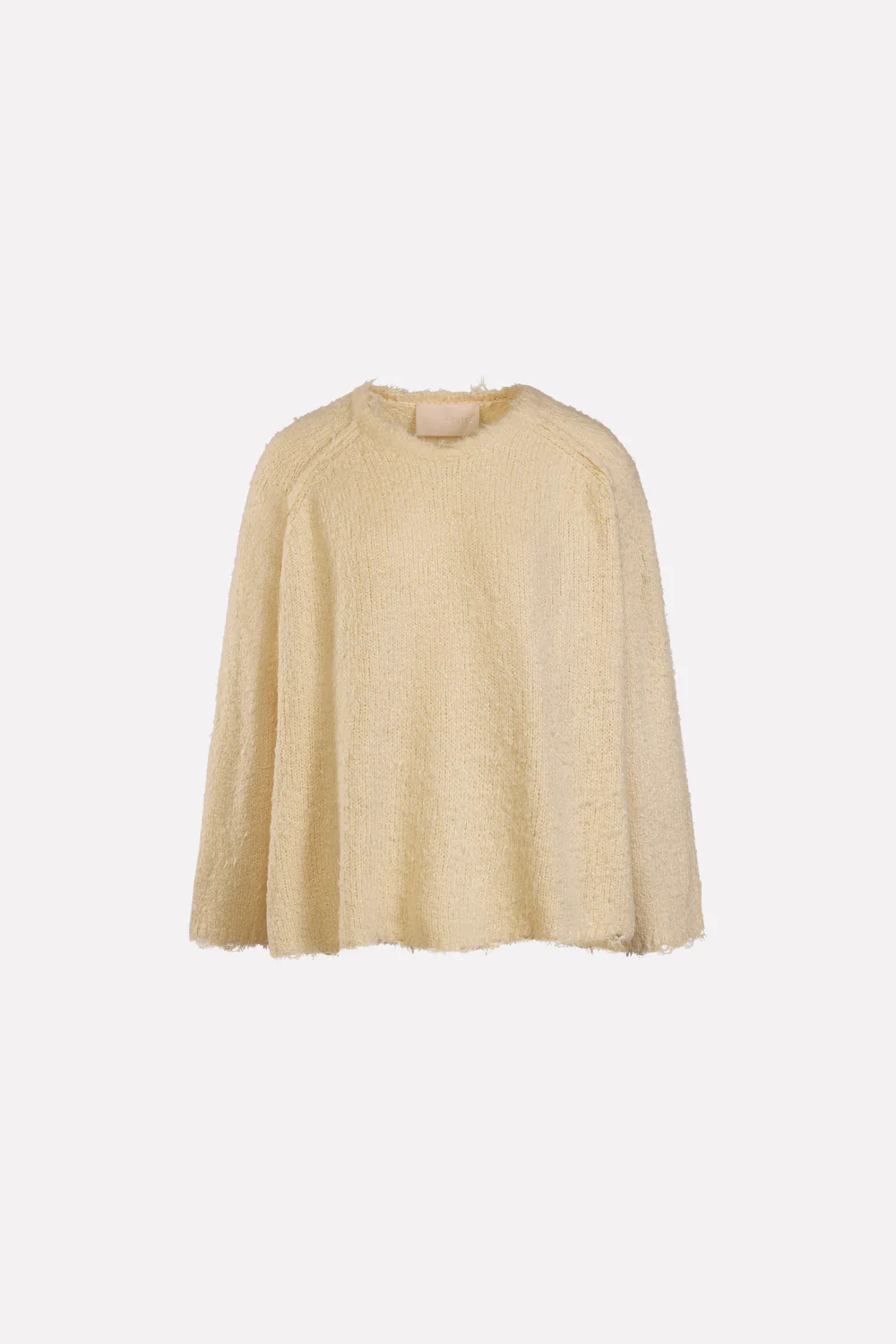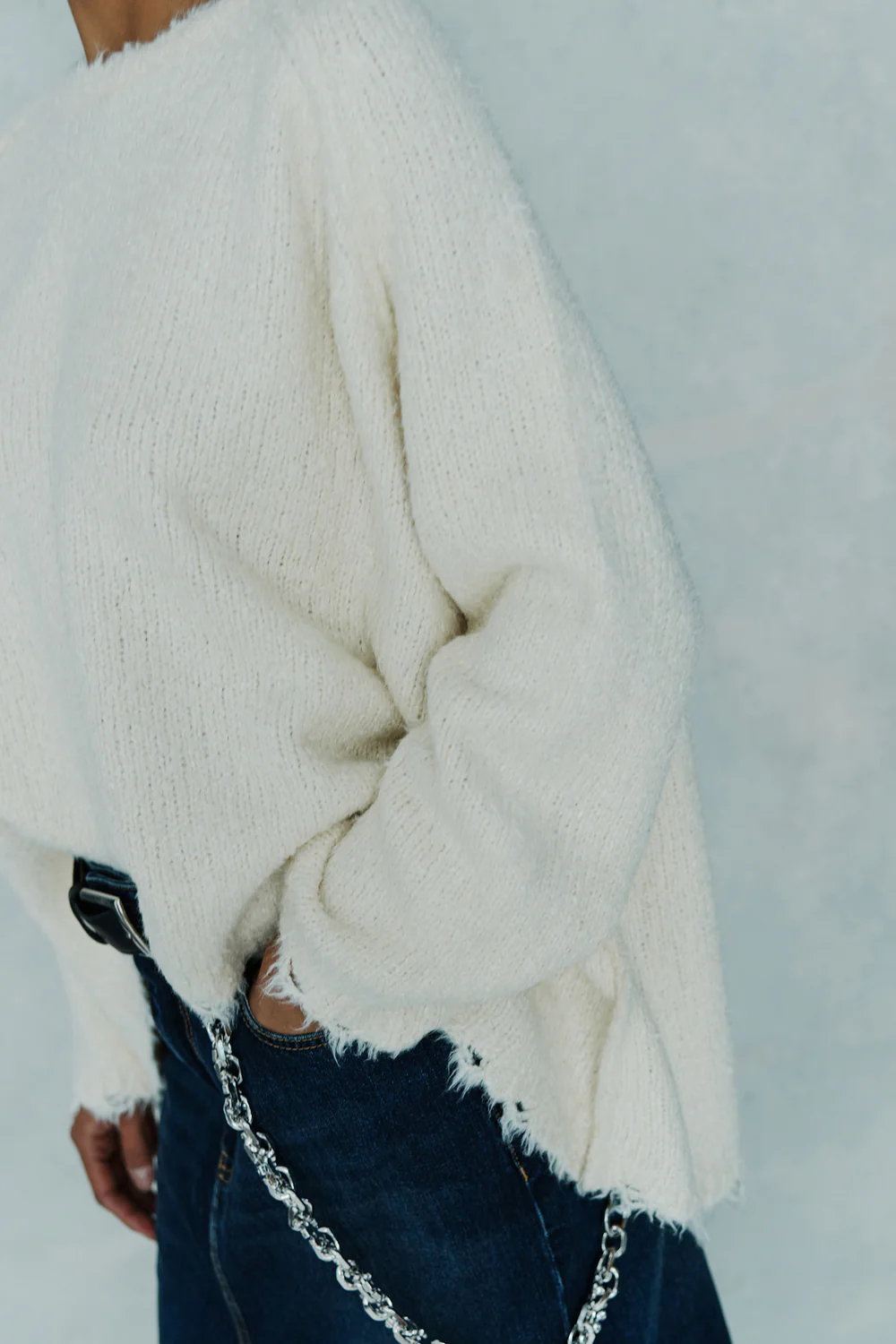 Lækker strik fra Circus Hotel. Strikken her er lavet af 100% silke, som gør den simpelthen så eksklusiv og blød. Strikken er chunky, med rund halsudskæring og frynse detaljer. Strikken fåes i creme og sort.