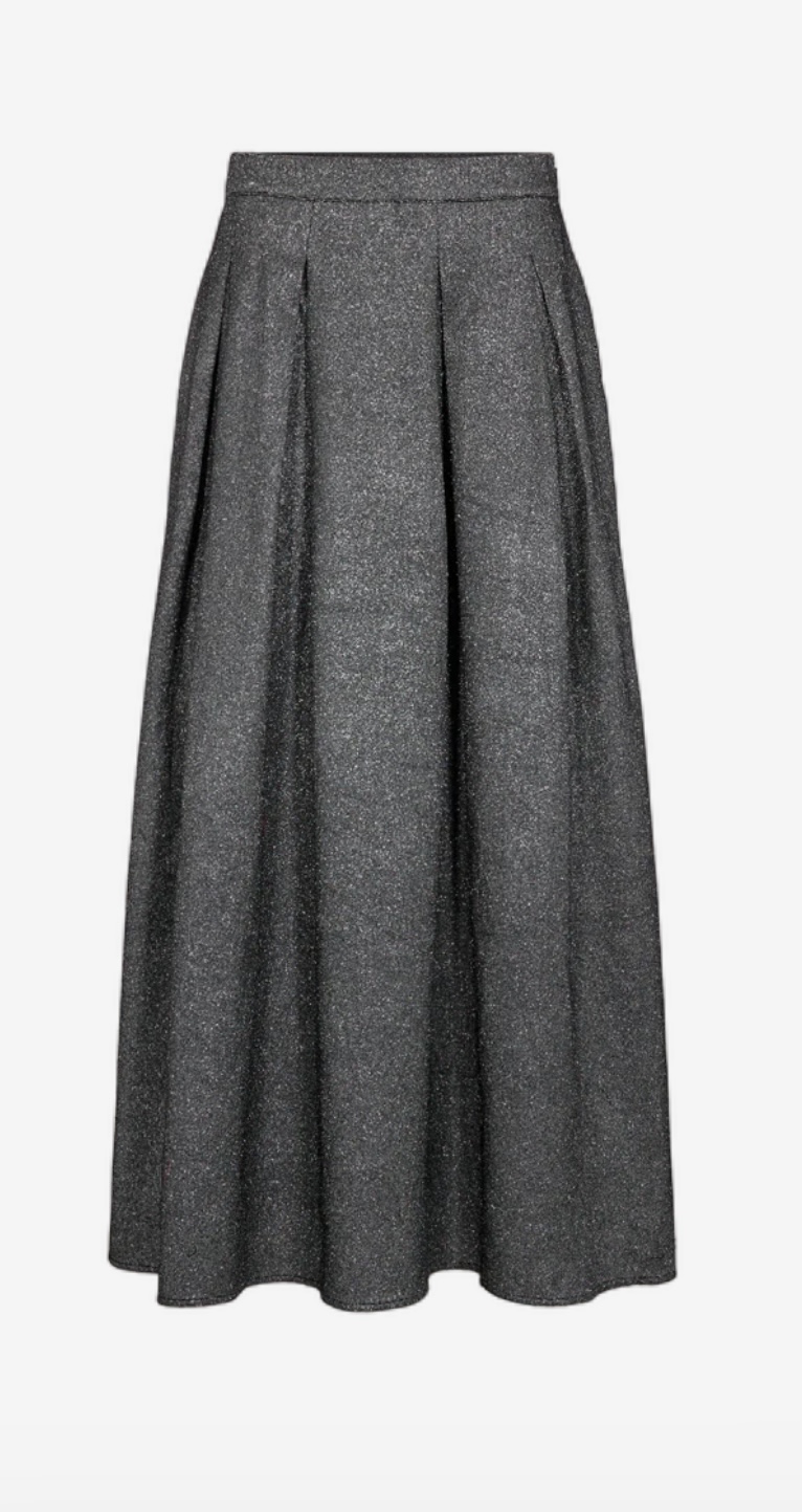 CMSHINMI-SKIRT er en nederdel i en super blød kvalitet med sort og sølv glimmermix og foring. Derudover har nederdelen en skjult lynlåslukning i siden, sidelommer samt brede læg, der giver et elegant, plisseret udtryk.