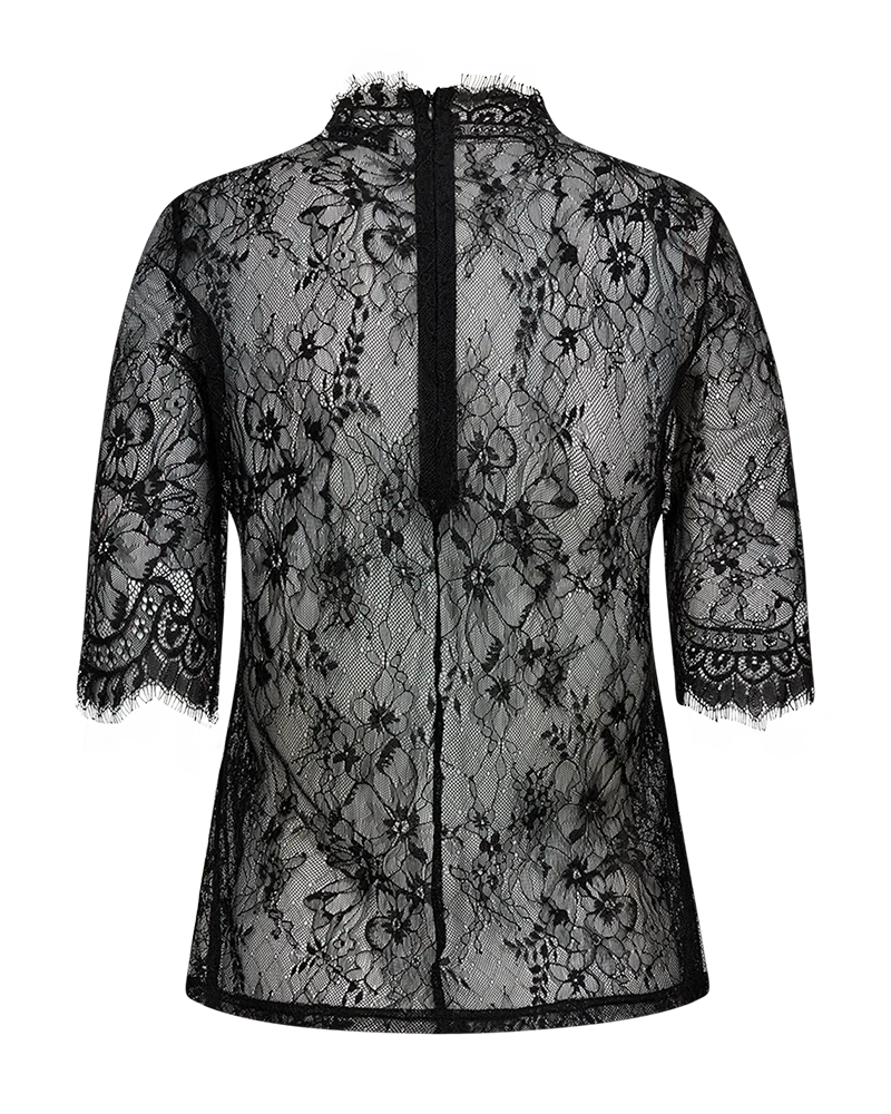 Smuk, tætsidddende blonde top fra Copenhagen Muse. Denne top har korte ærmer og en lille høj hals. Toppen lukkes med lynlås i nakken og er helt gennemsigtig. Den er lavet i smukke eyelash blonder.