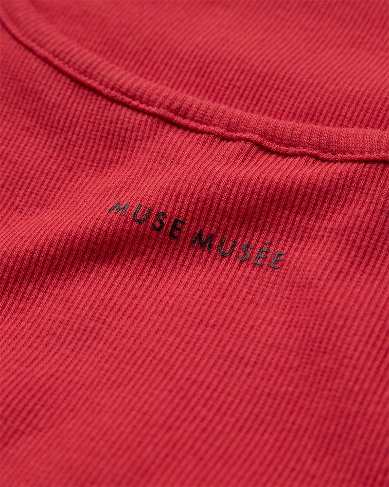 Lækker, ribbet top fra Copenhagen Muse. Toppen har tynde stropper, samt rund udskæring foran og bagpå. Toppen har ‘Muse Musée’ printet på fronten.