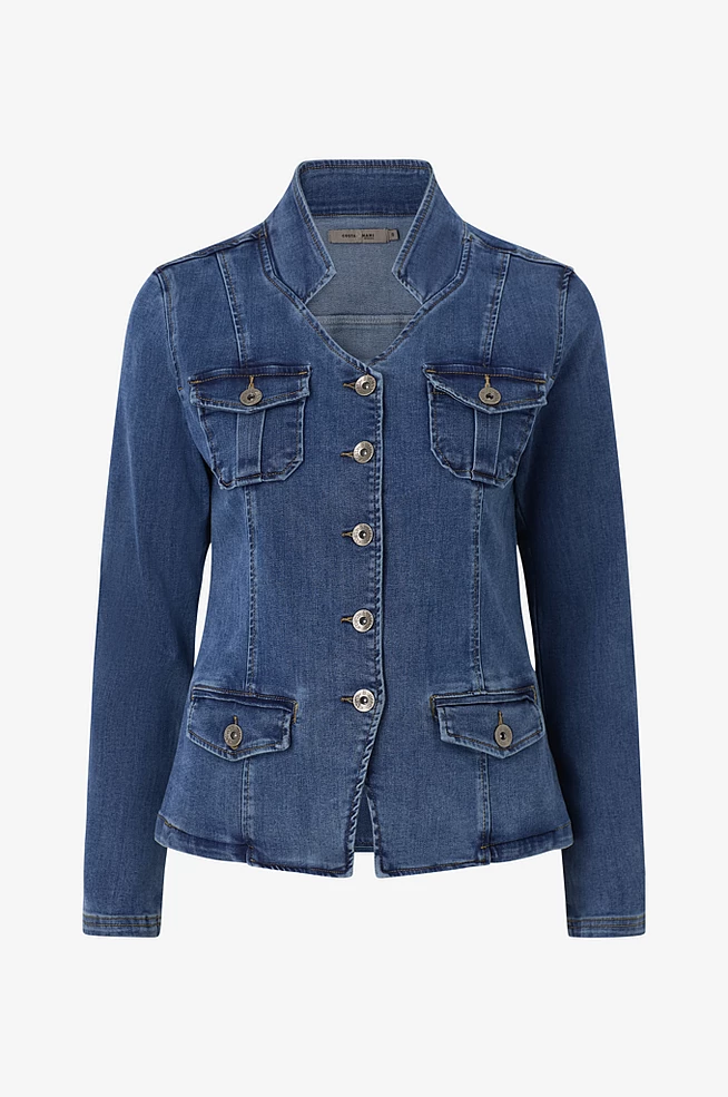 Klassisk denimjakke  med feminin pasform. Jakken har knaplukning, praktiske lommer og et tidsløst design, der gør den perfekt som overgangsjakke eller blazer til både hverdag og casual brug.