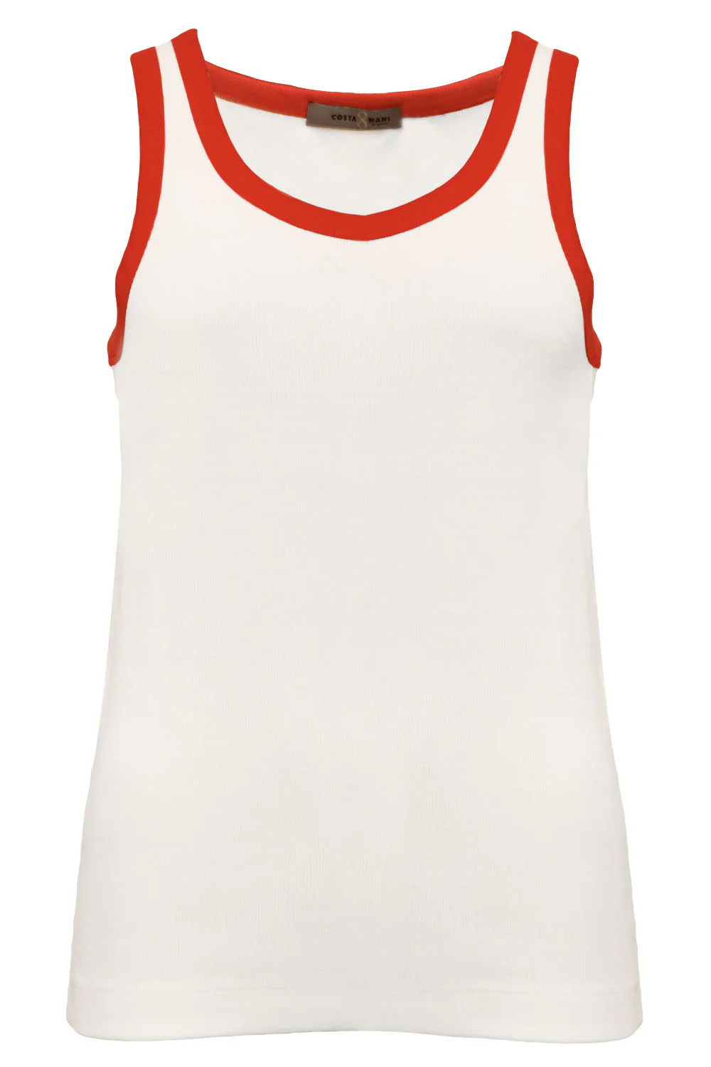 Klassisk hvid tanktop med kontrastfarver ved hals og ærmegab. Let og behagelig kvalitet med enkel pasform-perfekt til varme dage, sport eller som basis under andre styles.