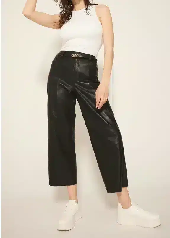 Fede skindbukser fra Depeche. Denne skindbuks er sort, med vidde 7/8 del benlængde. Buksen har fastlinning, med knap og lynlås og har sidelommer og baglommer. Buksen er højtaljet og har lige ben.