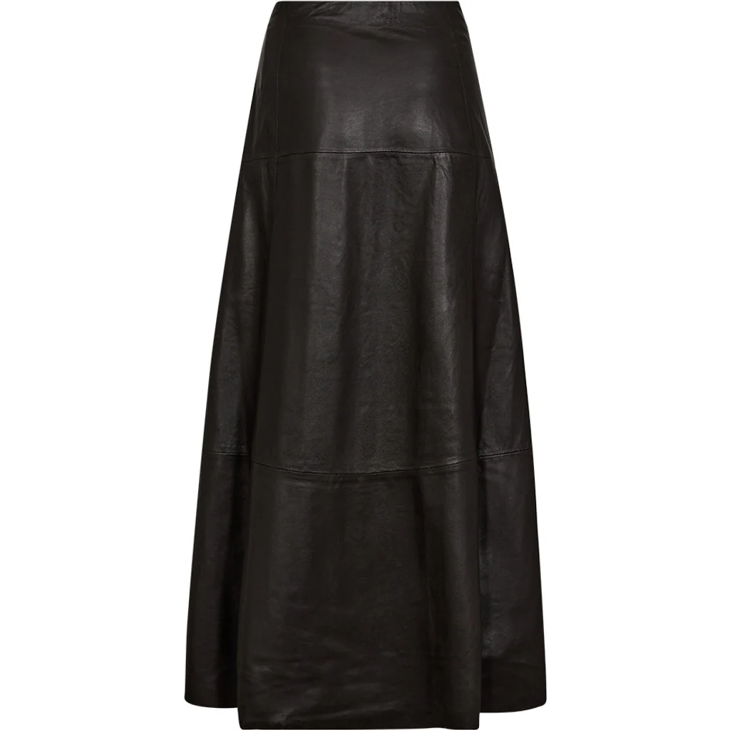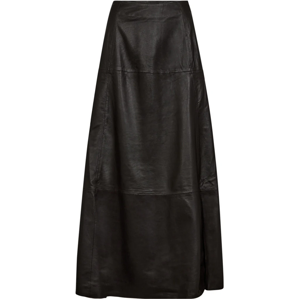 Smuk, lang skind nederdel fra Depeche. Nederdelen er i den fine farve ‘chocolate’. Nederdelen har lynlås i siden og et a-formet fit, hvor den sidder til foroven og bliver løsere i bunden. Nederdelen har et lavt slids i siden, som gør den bevægelig og feminin.