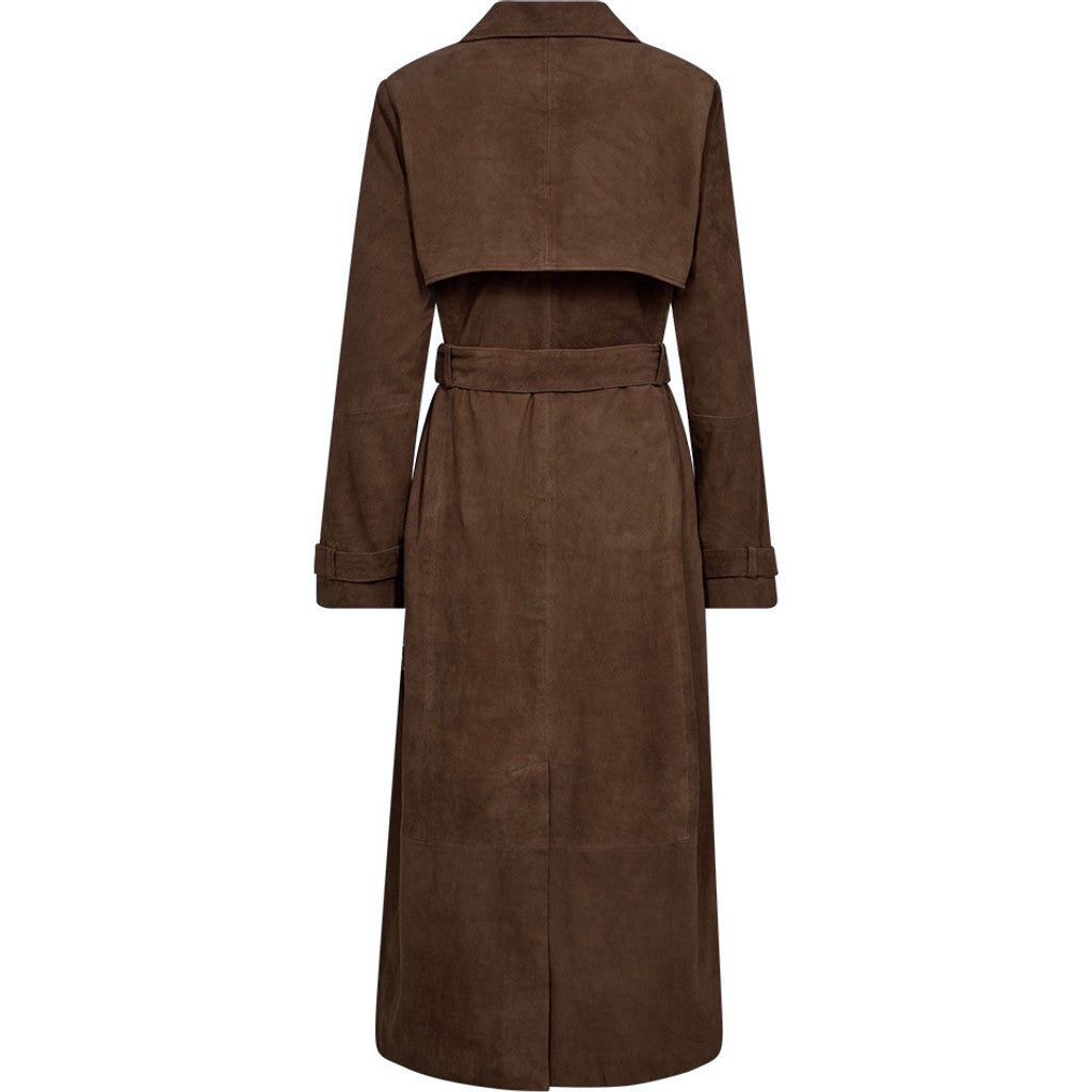 Super fed lang trenchcoat i ruskind, fra Depeche. Frakken er i farven ‘deer’, som er en flot mørkebrun farve. Frakken har et regular fit, med bindebælte i taljen og knapper til lukning. Frakken har et slids, samt et bærestykke bagpå. Frakken er fuld foret.