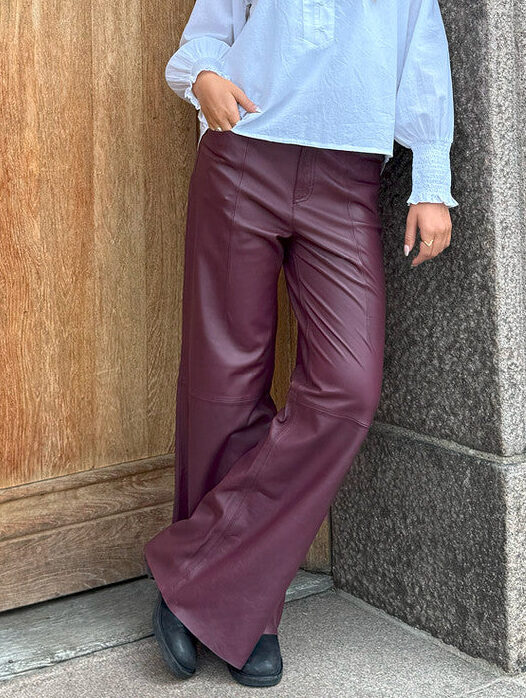 Nu lander disse top fede skindbukser, i en lækker efterårs farve – Burgundy. Højtaljede skindbukser, med vidde ben og fuld benlængde. Denne skindbuks lukkes med knap og lynlås og har sidelommer. Bukserne har også bæltestropper, så du kan sætte dit yndlings bælte i. Denne skindbuks er et absolut must i garderoben, både sommer og vinter.