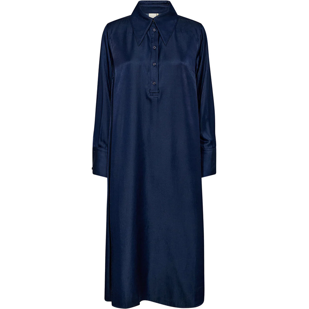 Smukkeste kjole fra Depeche i farven ‘midnight blue’. Kjolen her er a-formet, med halv knaplukning foran, samt almindelig krave. Kjolen har lange ærmer med knaplukning forneden, samt sidelommer.