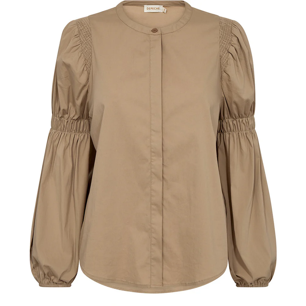 Skjorten har lange ærmer med fine smockdetaljer ved både skulder og midt på ærmet, hvilket skaber et blødt og feminint fald. Ærmekanterne har elastik, som giver en let puf-effekt