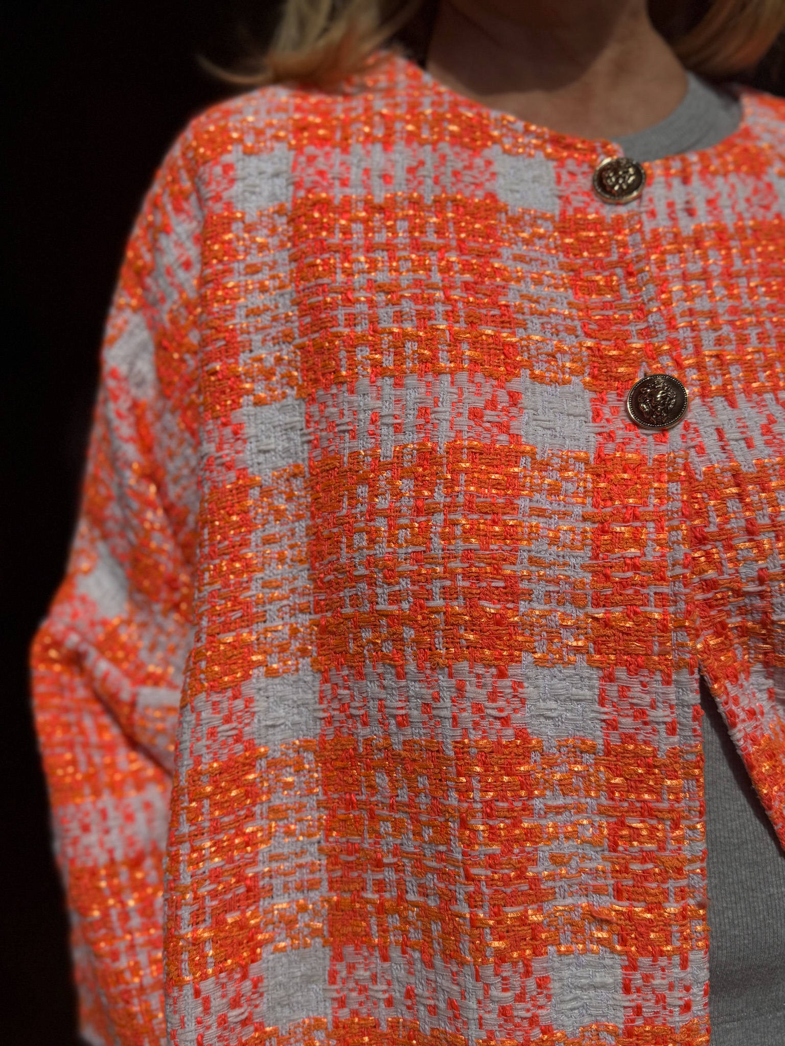Skøn lang frakke fra Design by Lærke. Kåben er ternet orange/hvid og lukkes med de fineste knapper foran. Frakken har de fineste vidde ærmer og er foret med et fint rosa farvet stof.