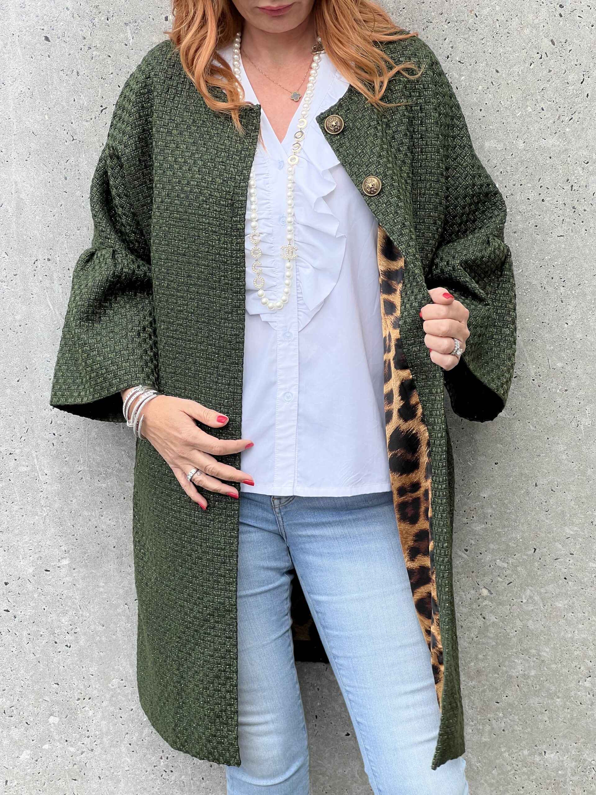 Smuk grøn frakke fra Imperial i bouclé. Frakken har flomme ærmer og en guldknap til lukning foran. Jakken er foret med et flot leopard stof.