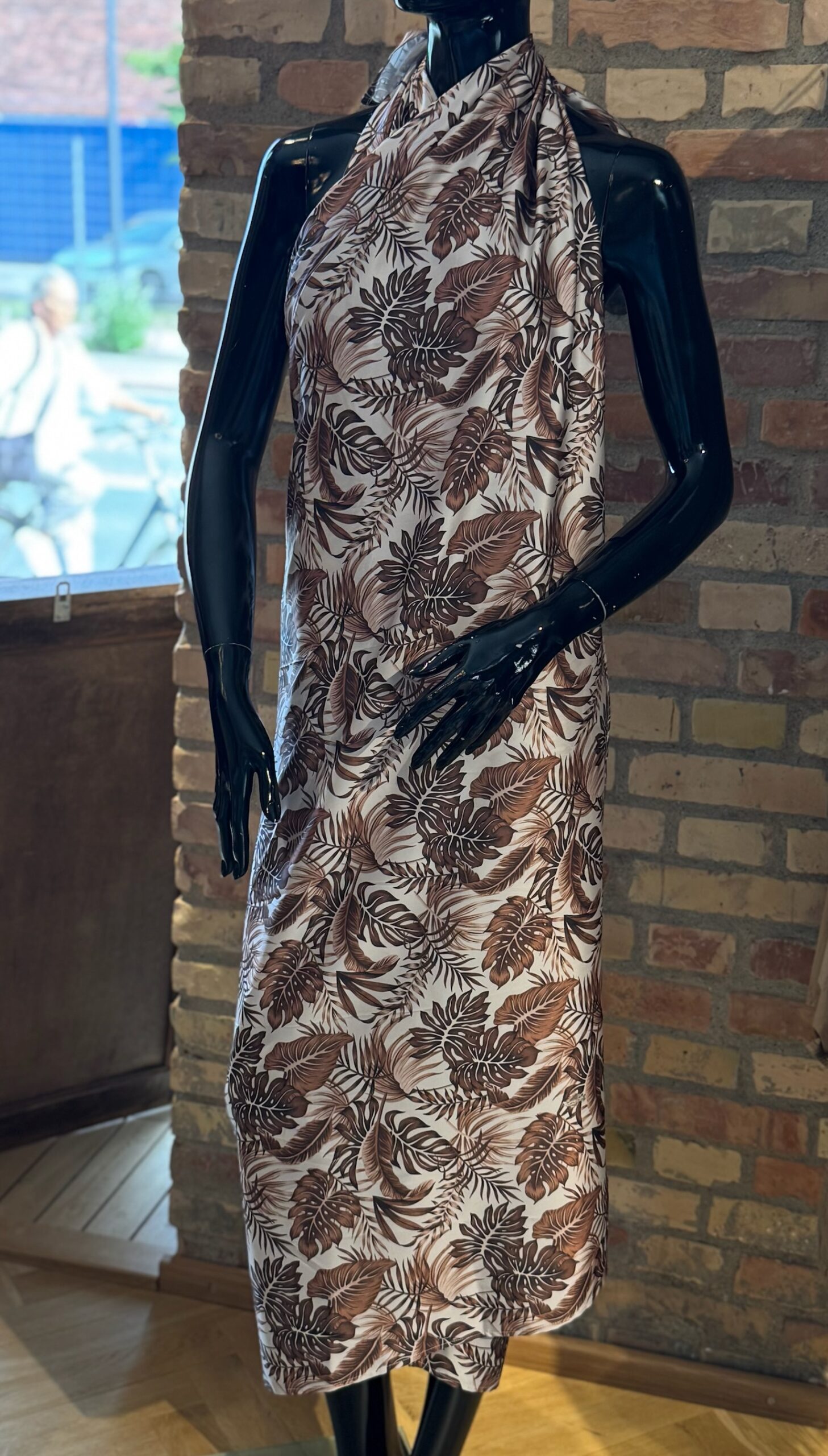Flot sarong fra Design by Lærke. Denne sarong er lavet i hvid, med smukke brune blade på sig. Sarongen er et stor stykke kvalitets stof, som kan bindes forskelligt og er nem at tage med overalt.