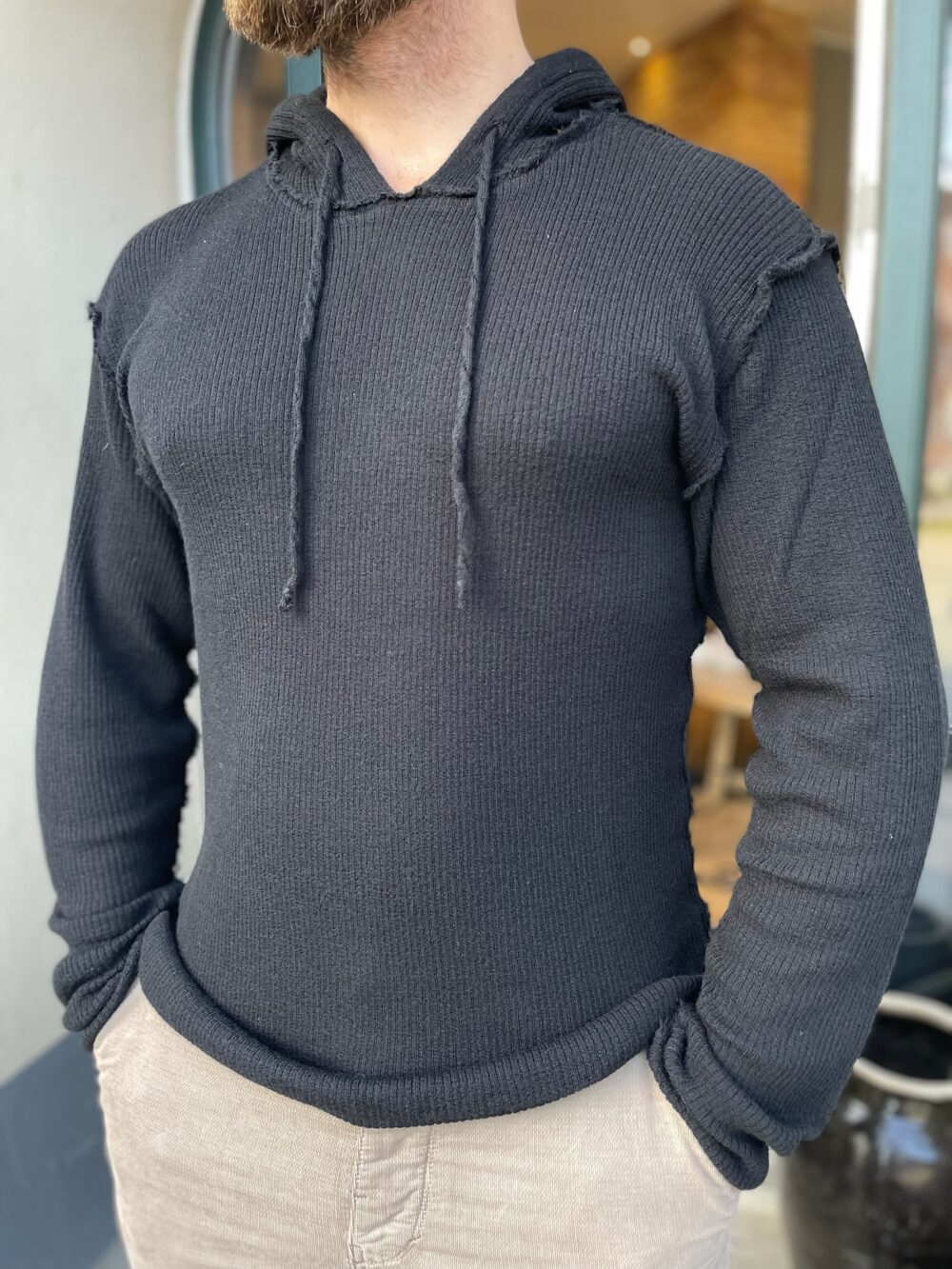 Super fed hættetrøje fra Gudrun&Gudrun i en blød uld kvalitet. Hættetrøjen er tætsiddende, men med en masse stretch. Den har en lille v-udskæring med snører.