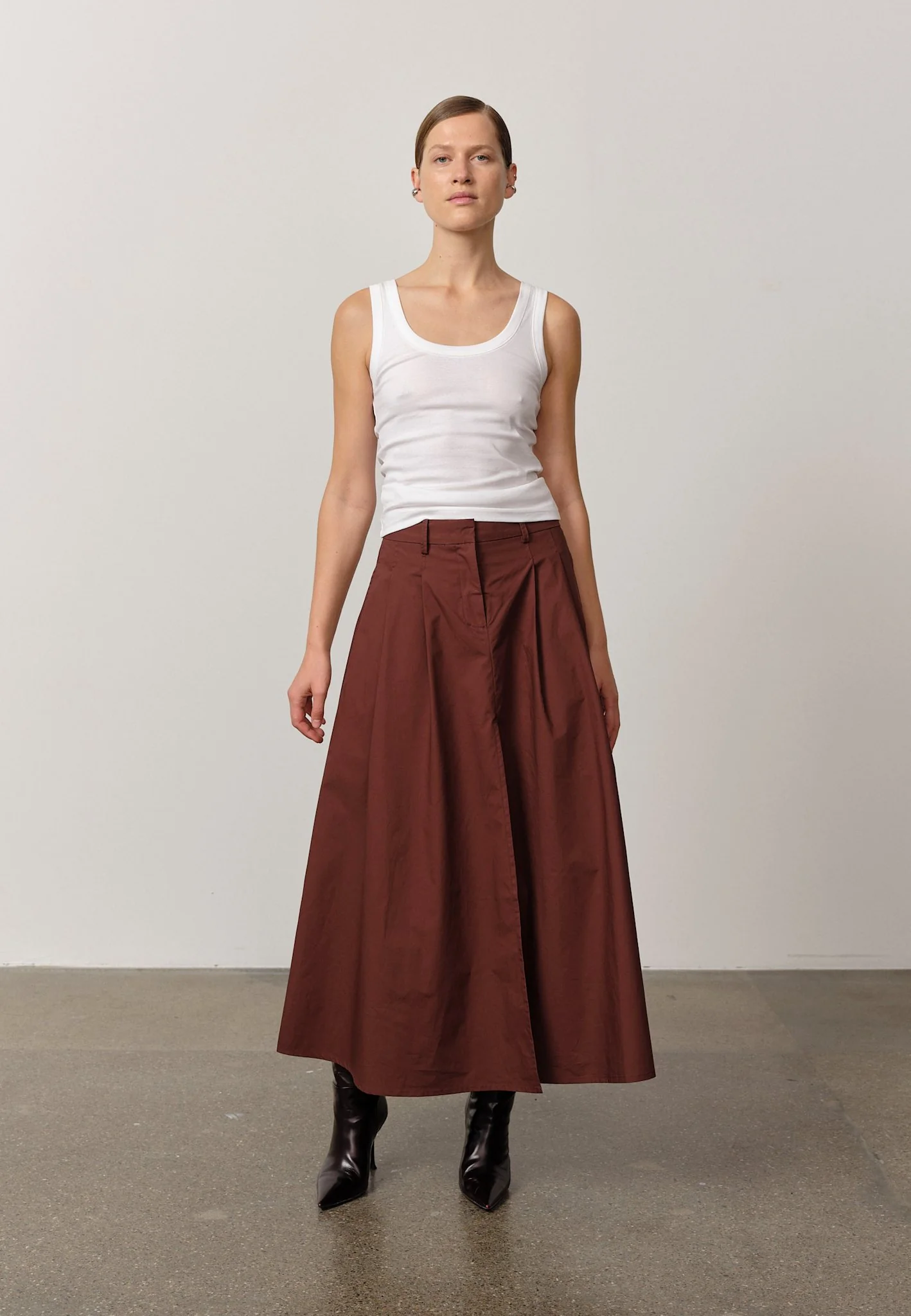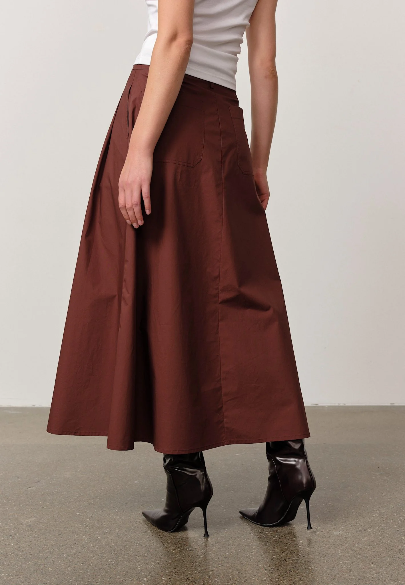 Skøn a-formet nederdel fra Herskind. Nederdelen er lang og fåes i smukke farver – khaki og mahogany. Nederdelen har et højt slids foran, samt sidelommer og bæltestropper. Nederdelen lukkes med lynlås og knap.