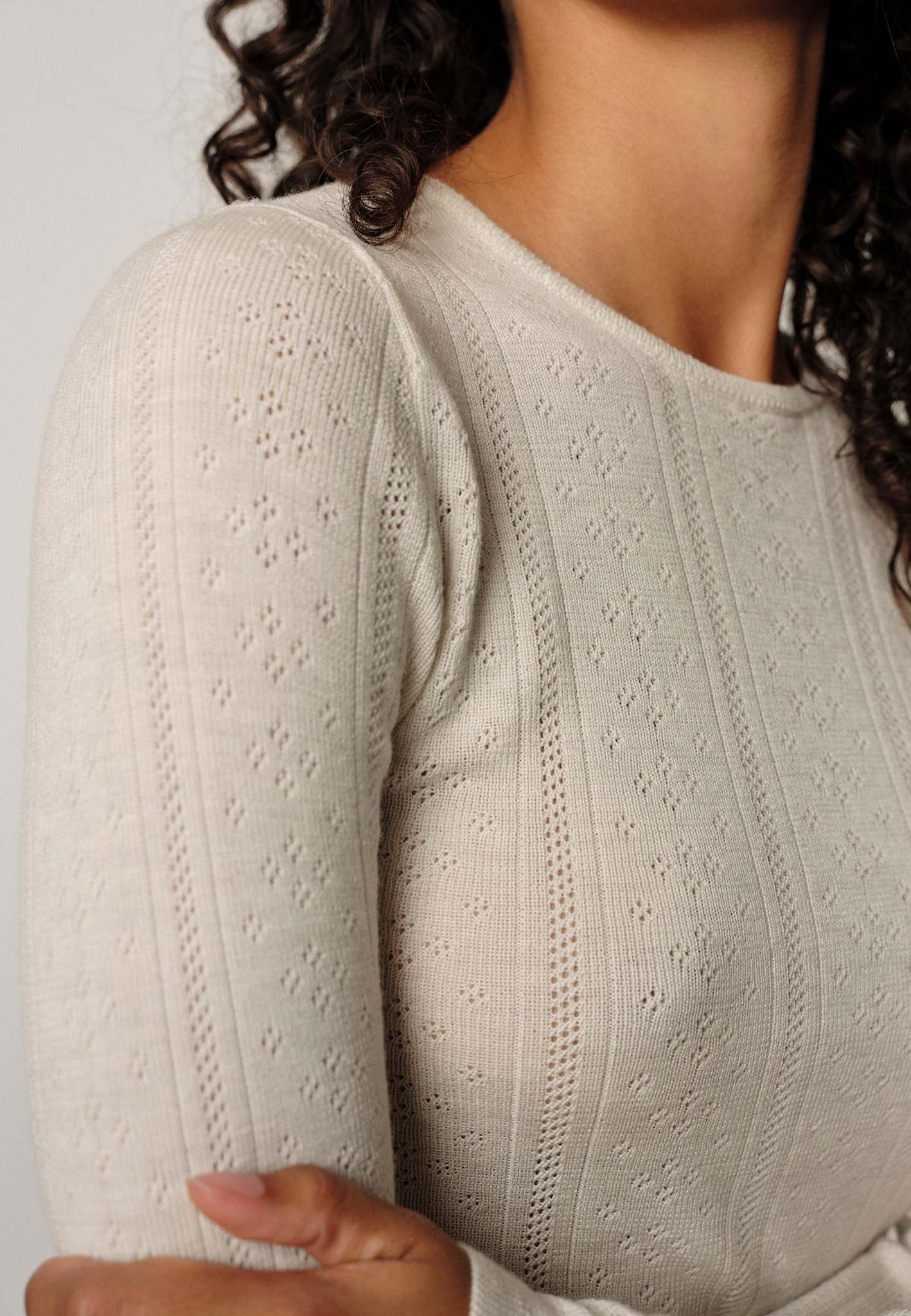Smuk tætsiddende bluse fra Herskind i off-white. Blusen har et flot hulmønster og er lavet i super blød merino uld, som er skønt her til efterår/vinter.