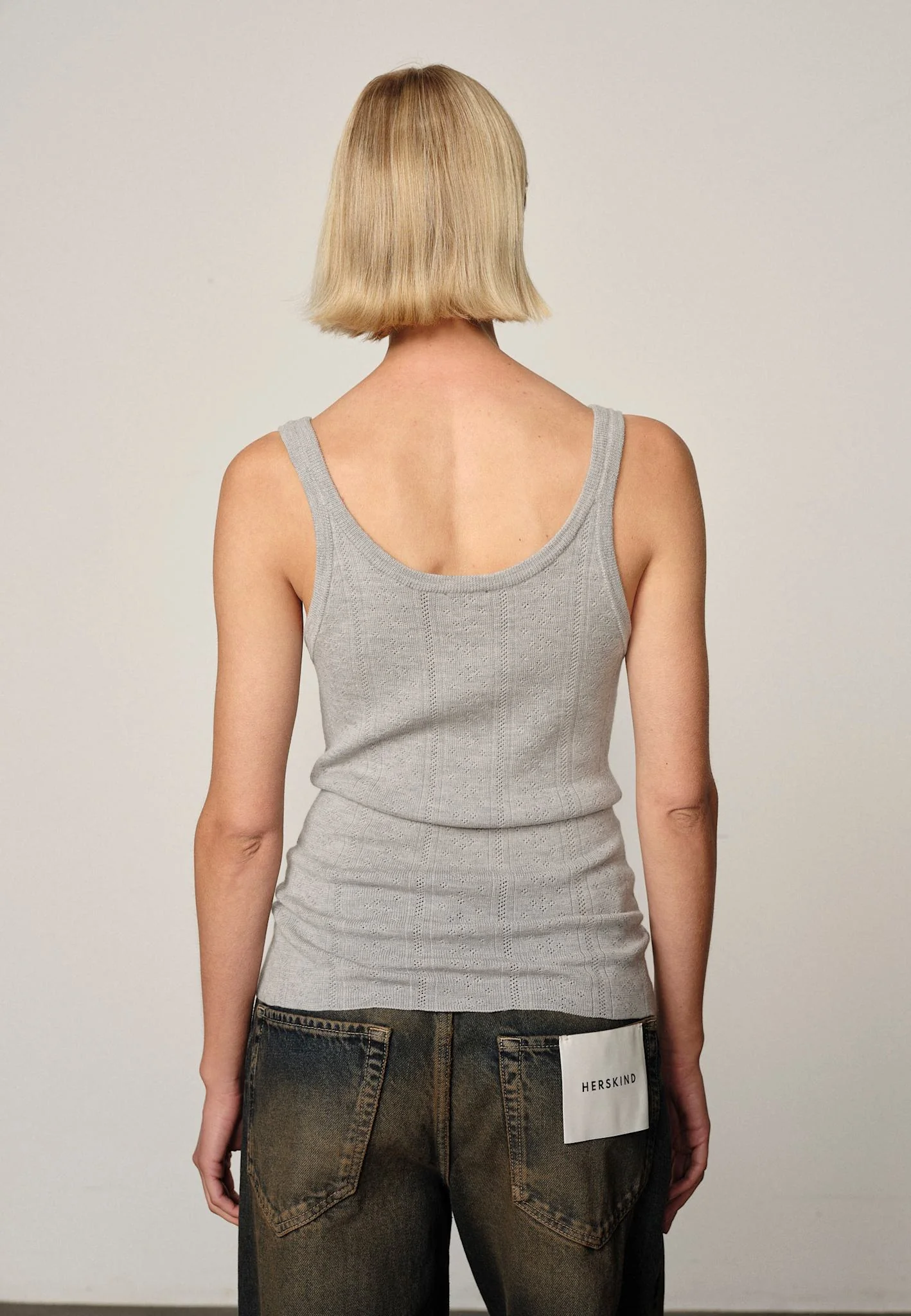 Skøn top fra Herskind i et flot hulmønster. Toppen fåes i off-white og grey melange. Toppen er lavet I 100% merino uld og oplagt til lag på lag.