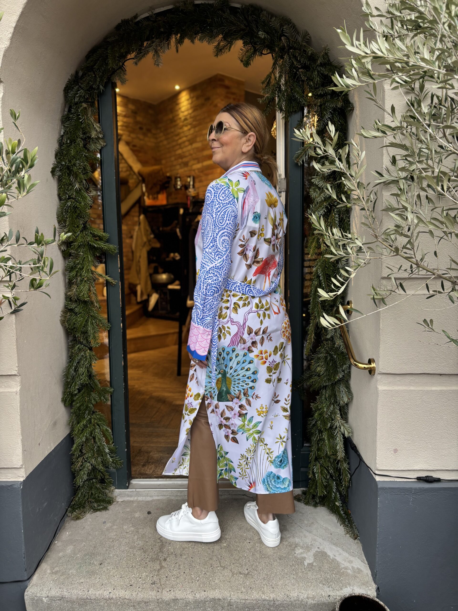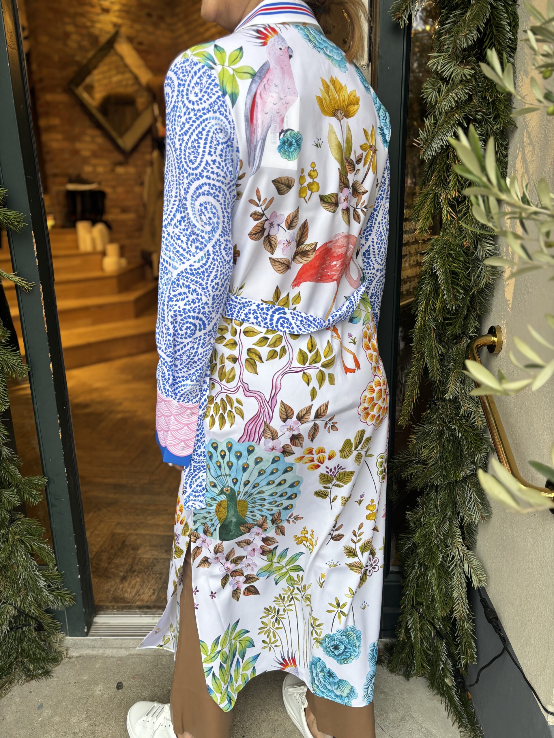 Meget smuk silke skjorte kjole fra Herzens. Kjolen er dekoreret med de smukkeste motiver, i de flotteste farver. Kjolen har knaplukning hele vejen ned og bindebælte med et smalt guldspænde. Den har sidelommer og almindelig krave.