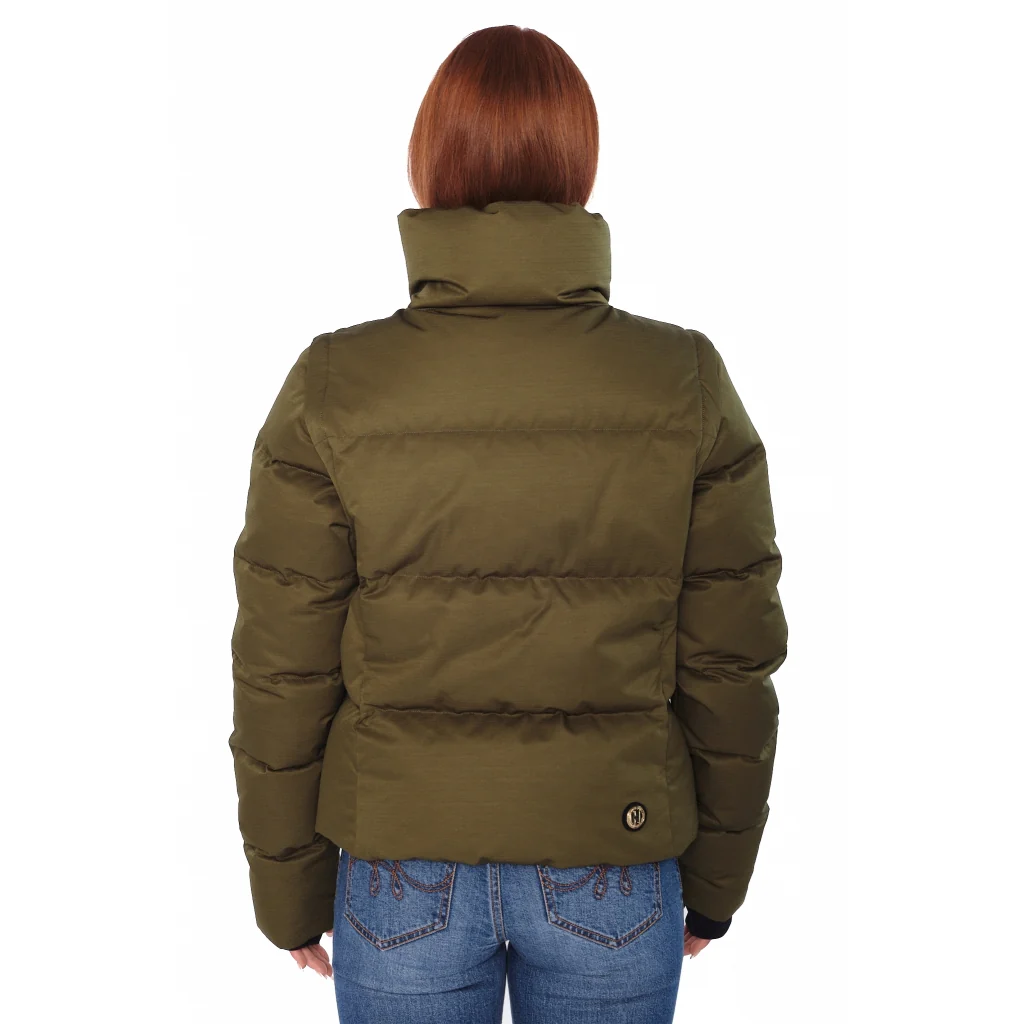 Mega fed dun jakke fra HÉST. Jakken er kort, i en flot og eksklusiv oliven grøn farve. Jakken har aftagelige ærmer med lynlås, så jakken bliver til en vest. Jakken lukkes med lynlås og knapper foran, i guld. Jakken har sidelommer og er lavet i en kvalitet der gør du holder varmen, selv i de koldeste tider.