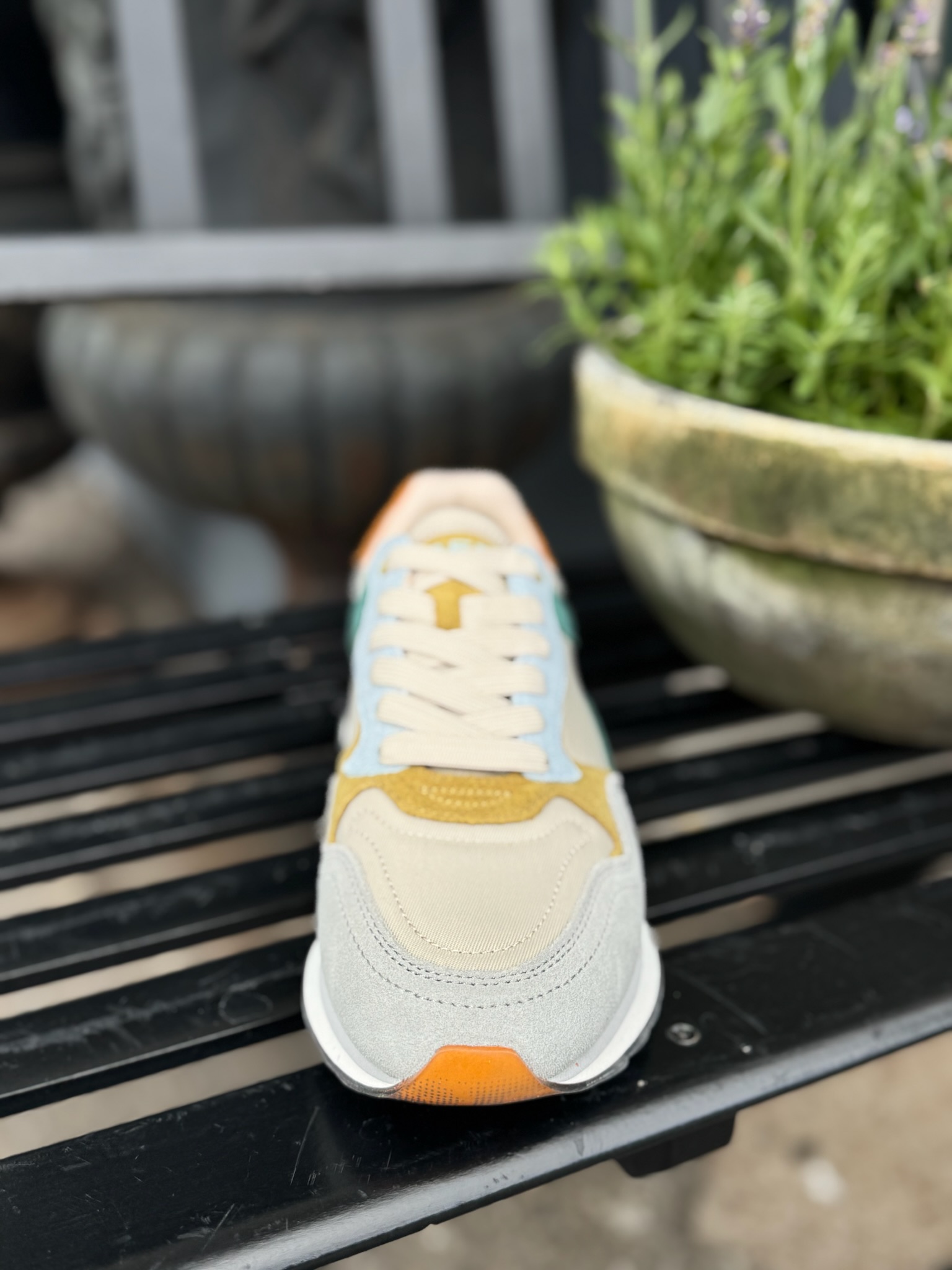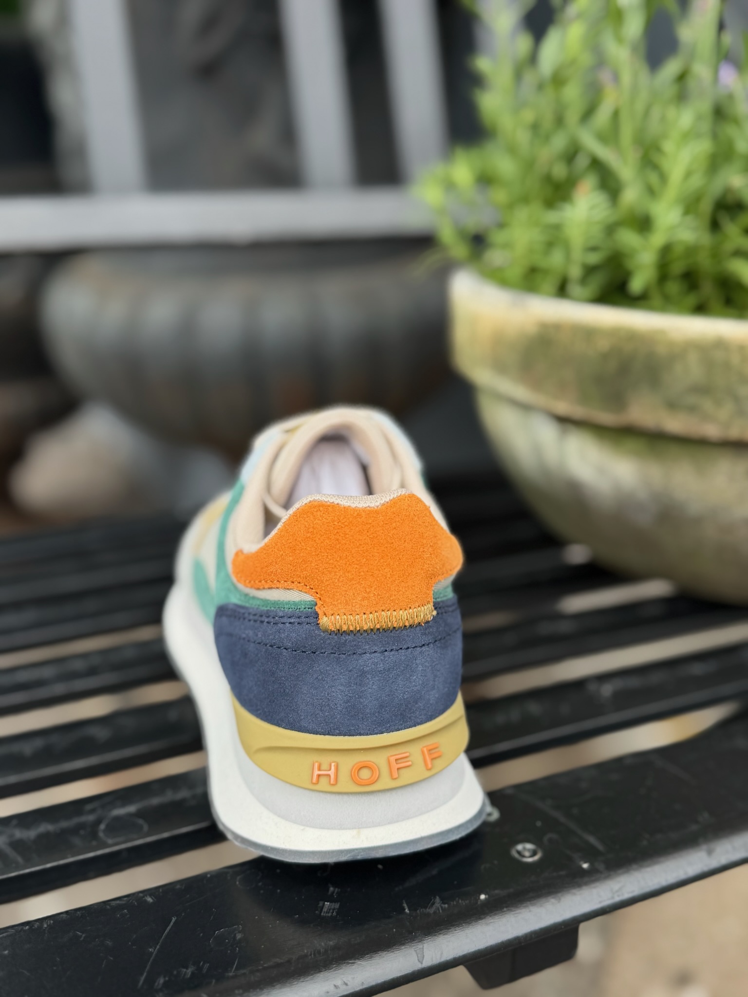Top fede nye sneakers fra Hoff. Disse sneakers er multi farvet, med blå, grønne, sand og orange farver og sand farvede snørebånd. Sålen er 3 cm høj og sålen indeni skoen er lavet af memory foam, som sikrer dig en blød og stabil sko at gå rundt i.