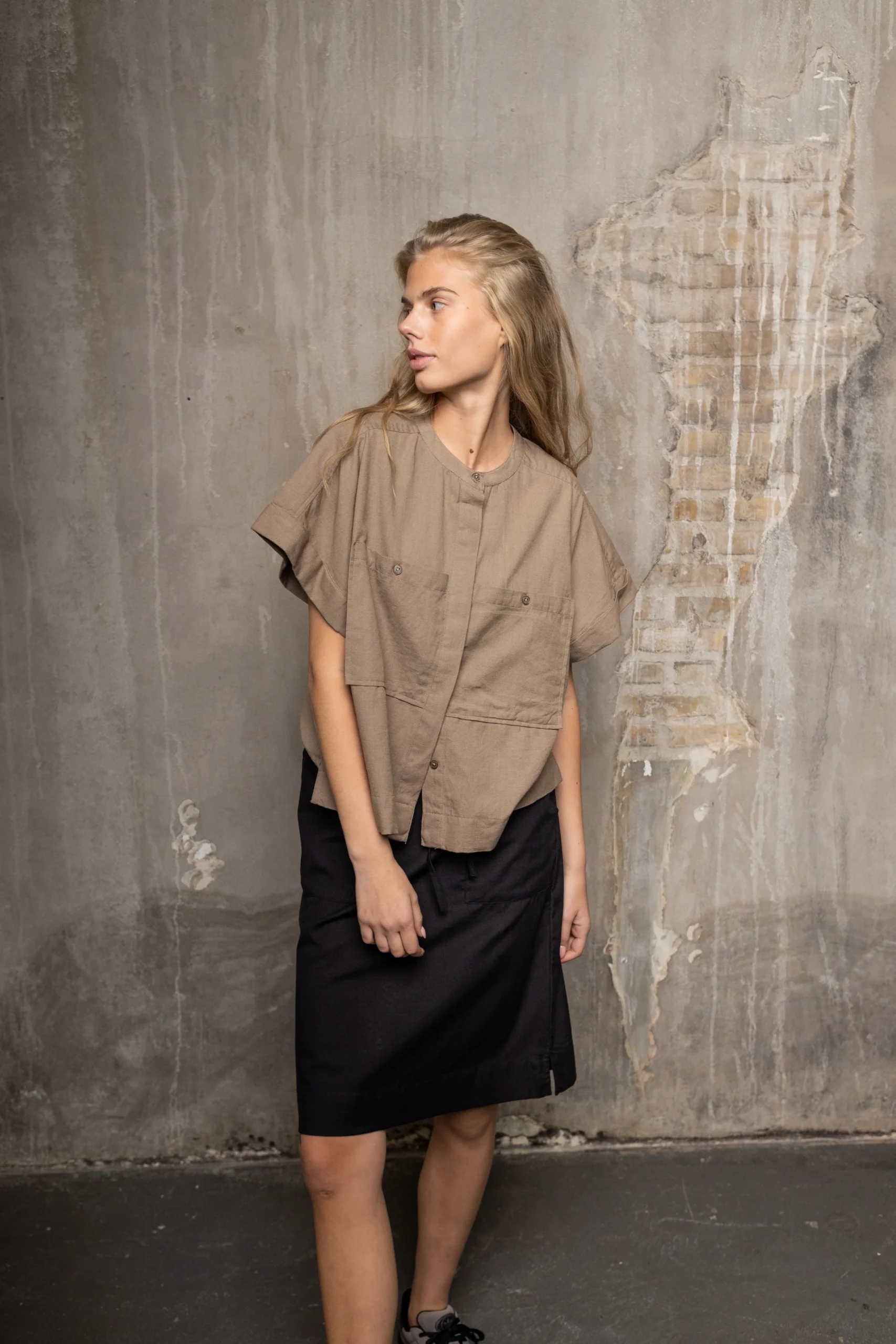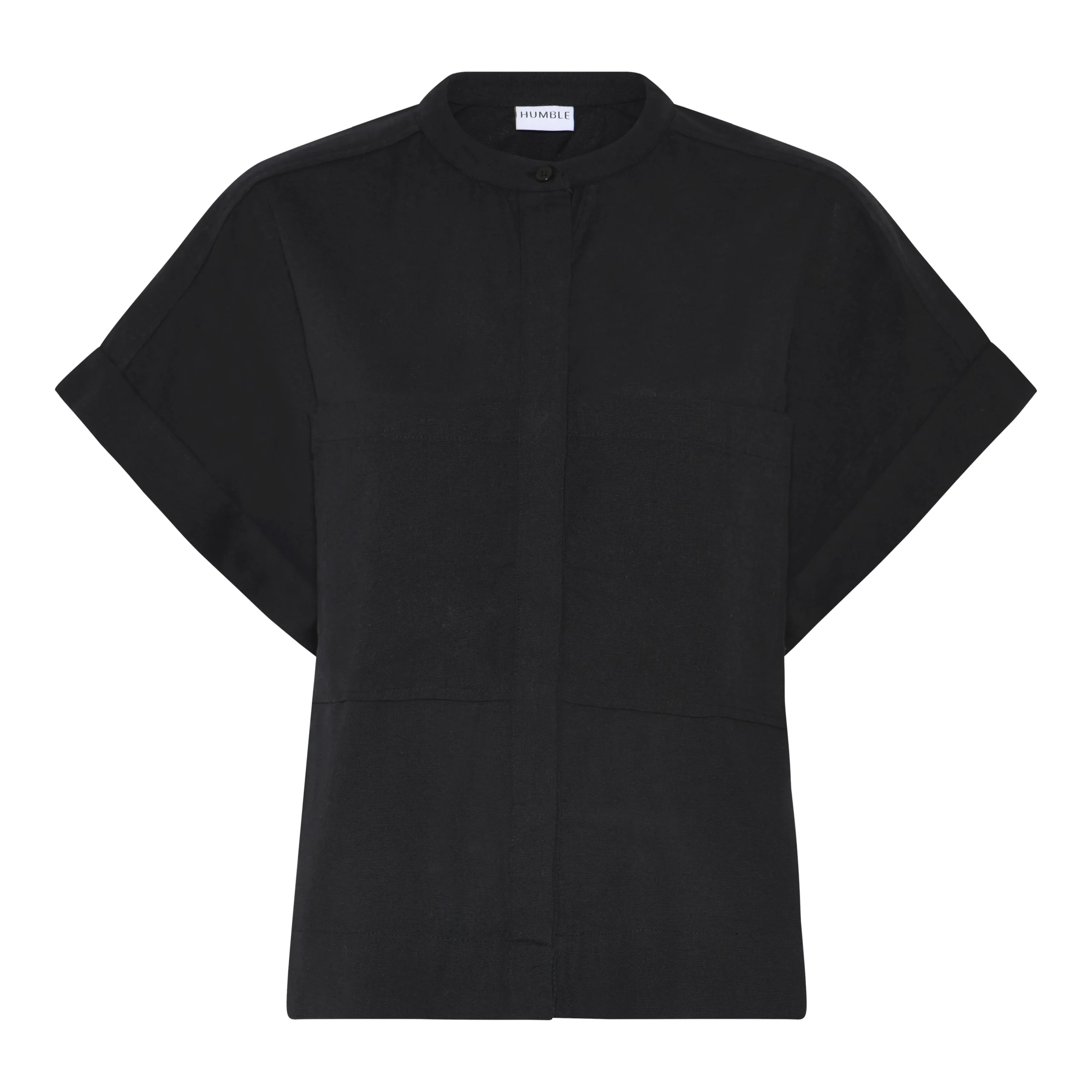 Lækker, kortærmet skjorte fra Humble. Denne skjorte har korte ærmer, samt usynlig knaplukning foran. Skjorten er løstsiddende og fåes i sort og brun.