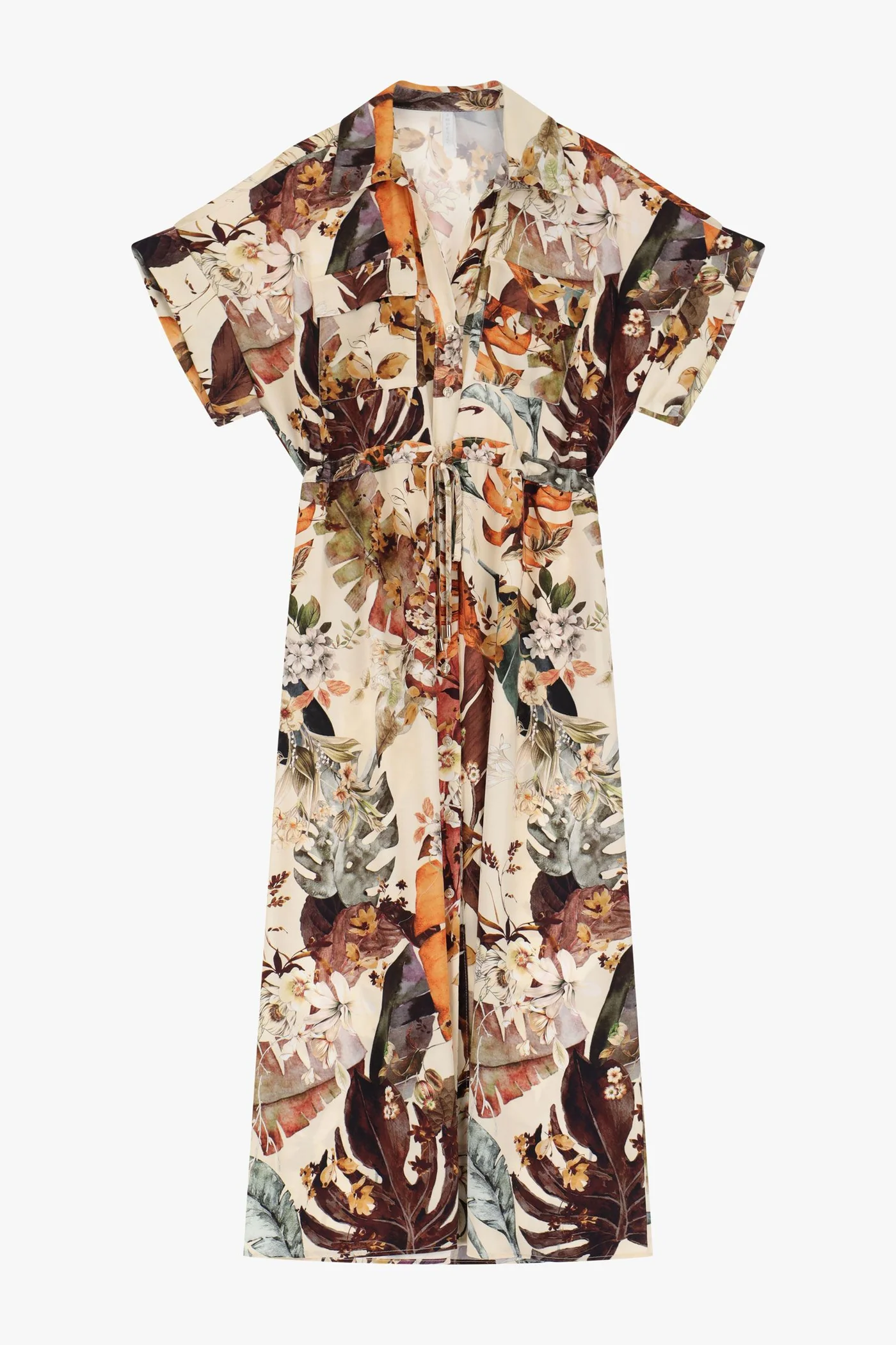 Skønneste blomstrede kjole fra Imperial. Kjolen er lang, i et smukt hvidt og multifarvet blomstret print. Kjolen er lang, med knaplukning hele vejen ned og snører i taljen. Kjolen har mellemkorte ærmer og en v-udskæring. Kjolen har sidelommer.