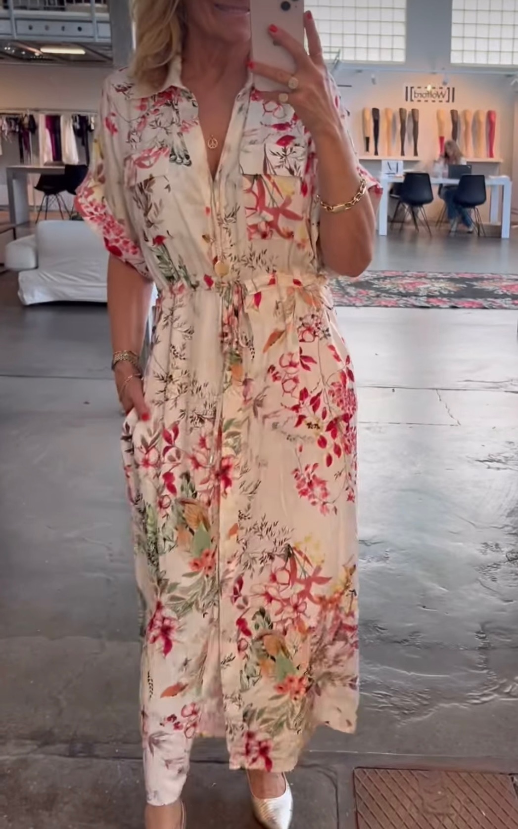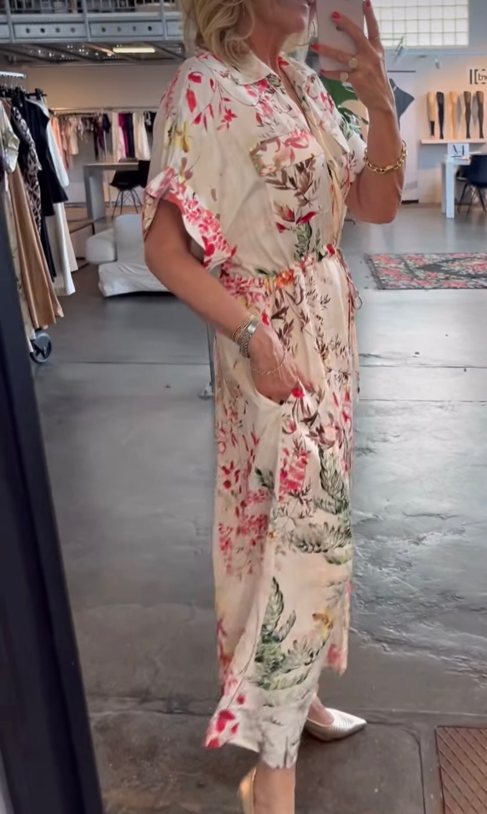 Skønneste blomstrede kjole fra Imperial. Kjolen er lang, i et smukt hvidt og multifarvet blomstret print. Kjolen er lang, med knaplukning hele vejen ned og snører i taljen. Kjolen har mellemkorte ærmer og en v-udskæring. Kjolen har sidelommer.