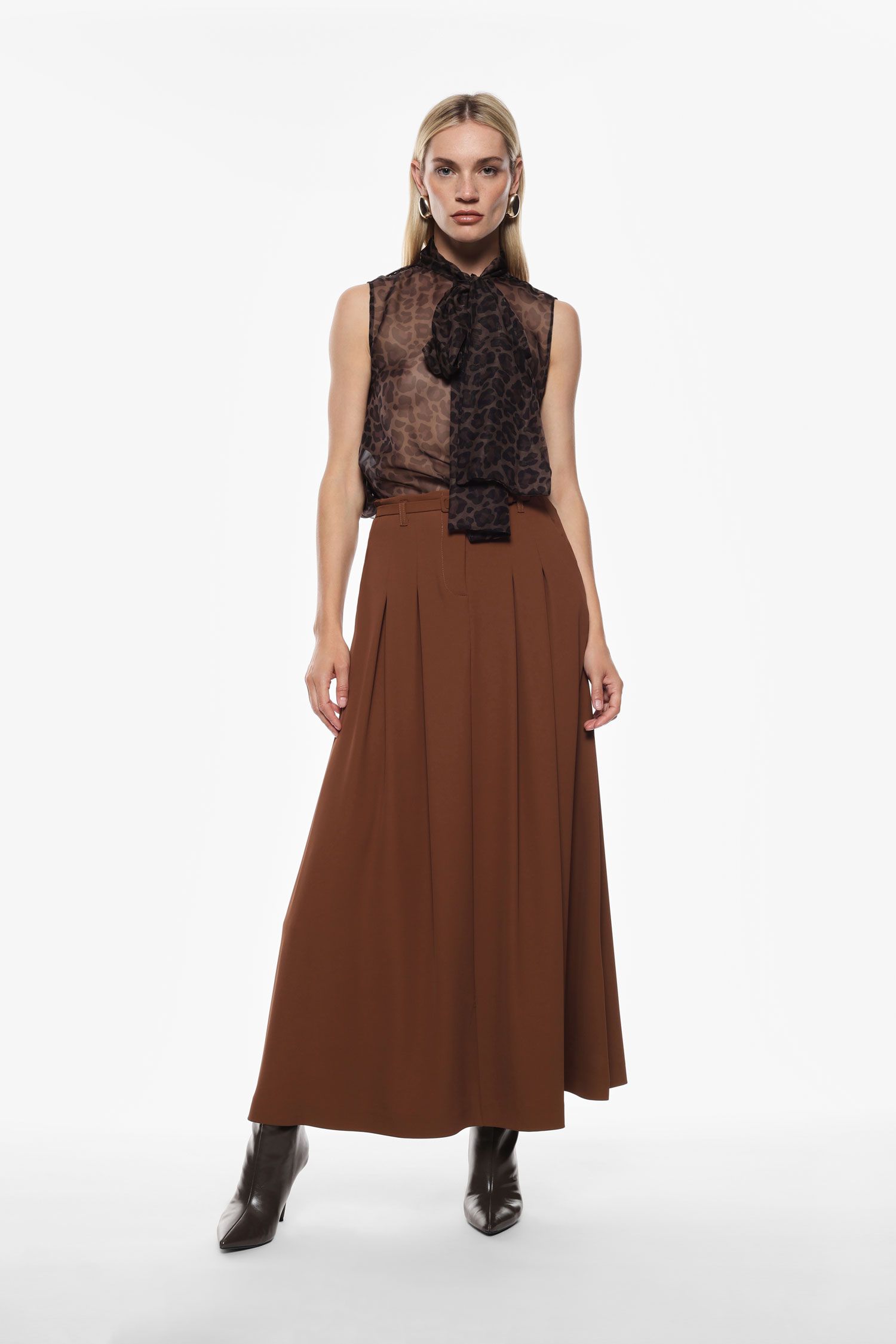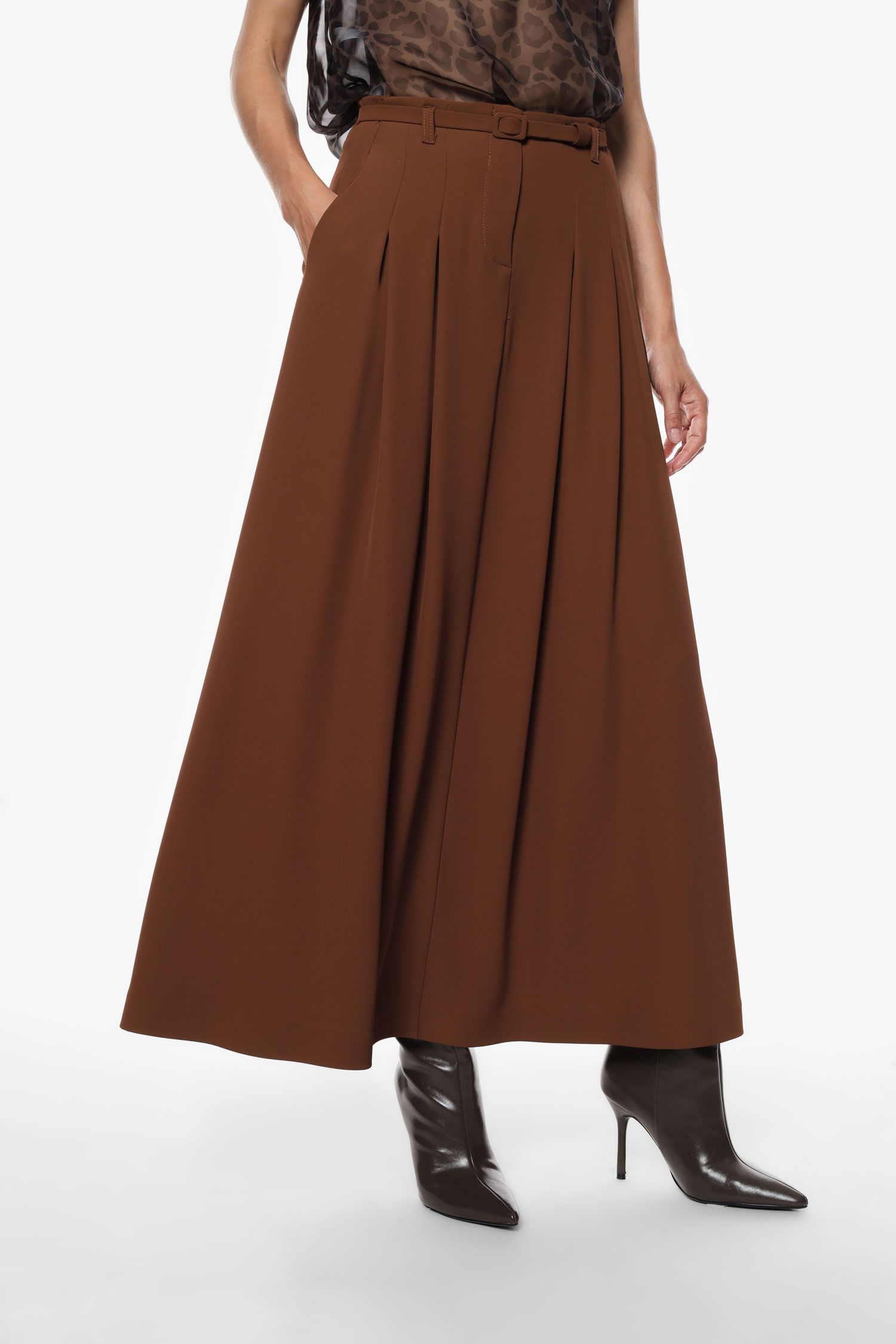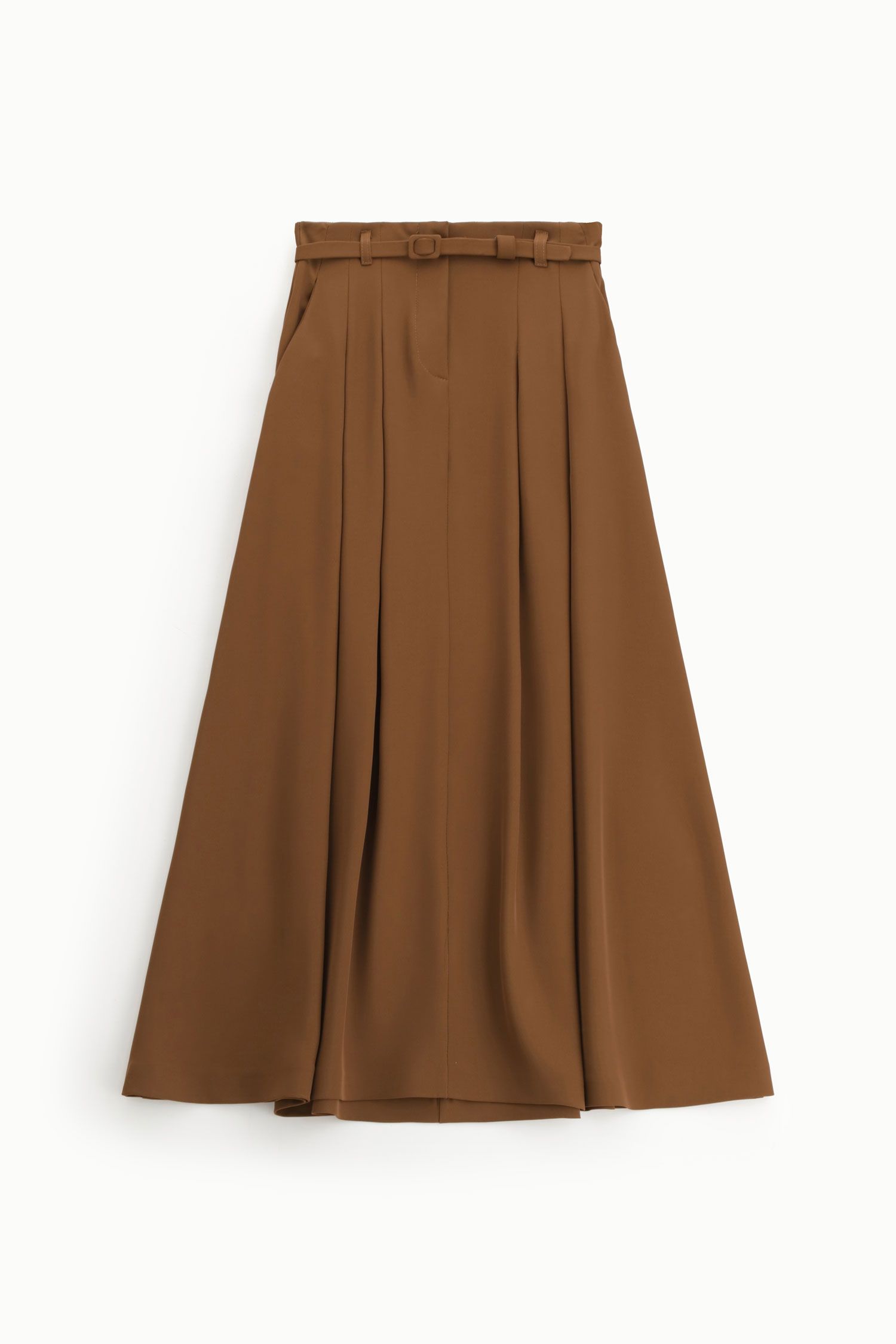 Flot, lang nederdel fra Imperial. Nederdelen er i farven ‘castagna’, som er en varm lys brun farve. Nederdelen har en smuk a-formet facon og lynlås lukning, med et medfølgende smalt bælte.