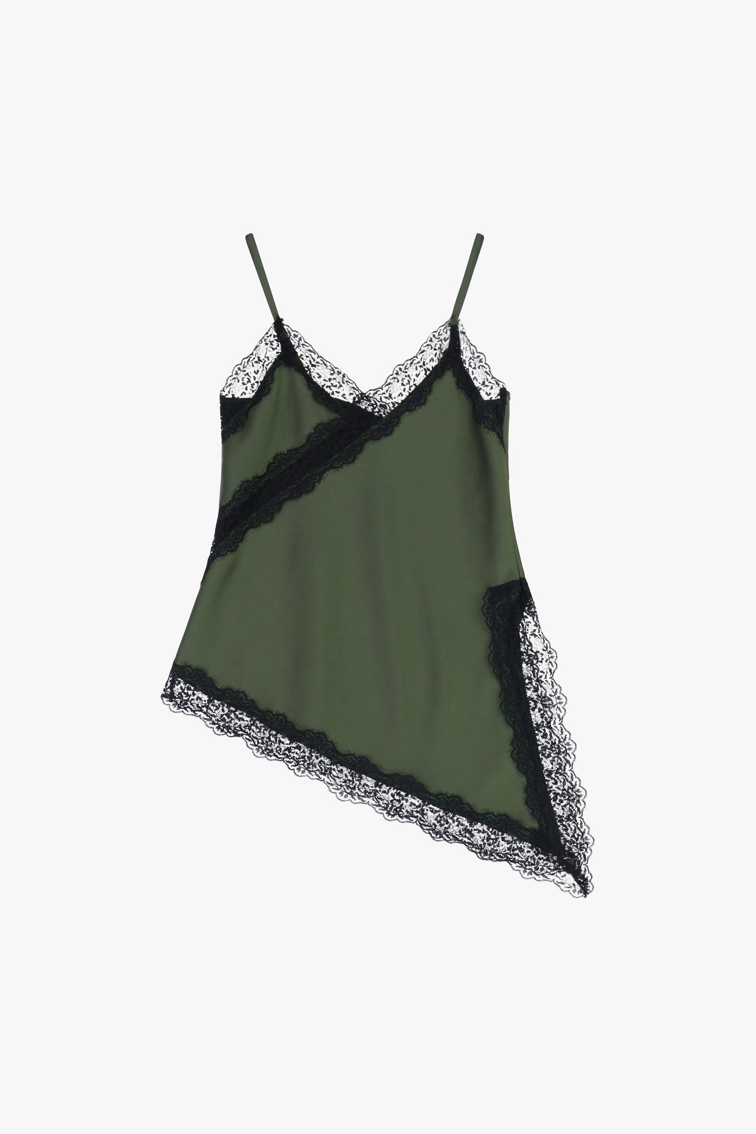 Smuk asymmetrisk blonde top fra Imperial. Toppen har tynde stropper, blonde detaljer og et slids i siden. Toppen fåes i army grøn og brun.