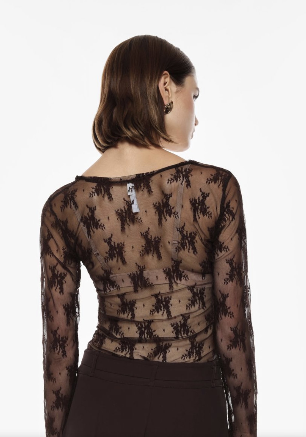 Lækker mesh bluse fra Imperial. Blusen har fine blonde dekorationer på og er let og blød.