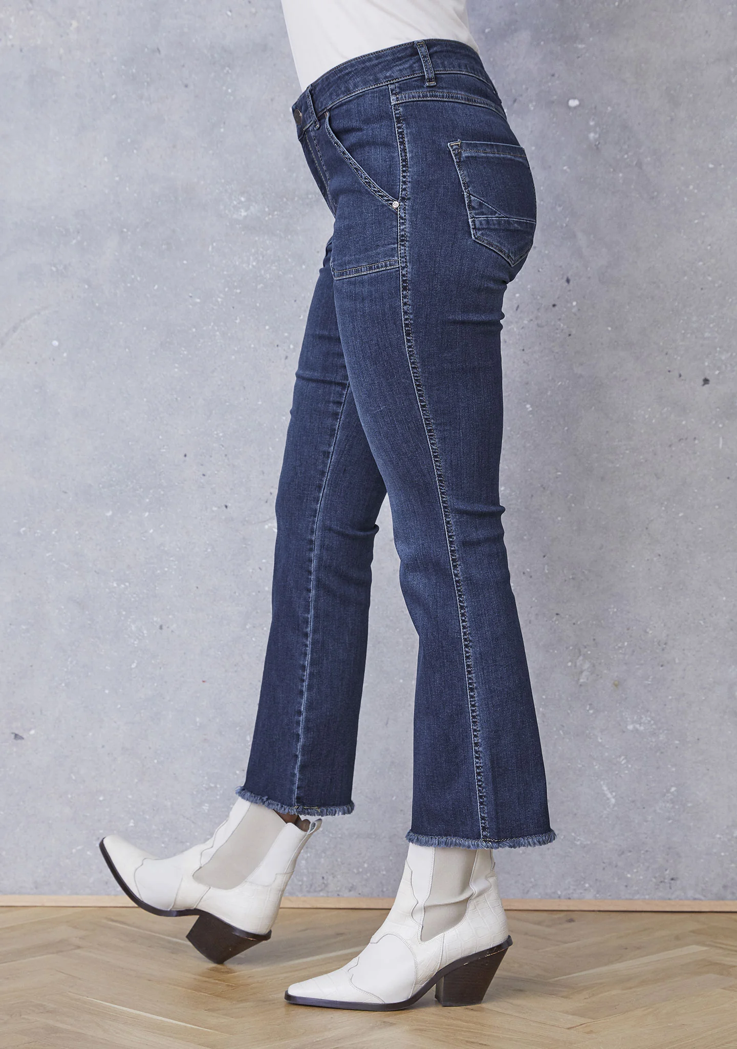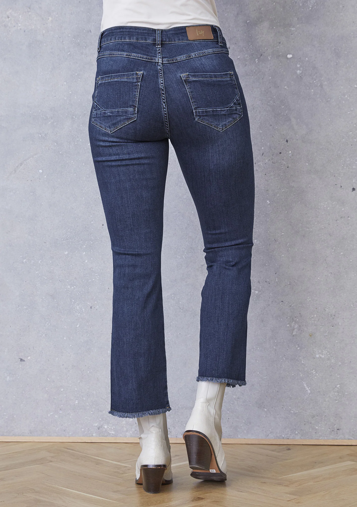 Fede jeans fra ISAY. Disse jeans er vasket mørkeblå, med 7/8 del længde og frynser i bunden. Bukserne har forlommer og baglommer. Bukserne har bootcut facon, med svaj i benene.