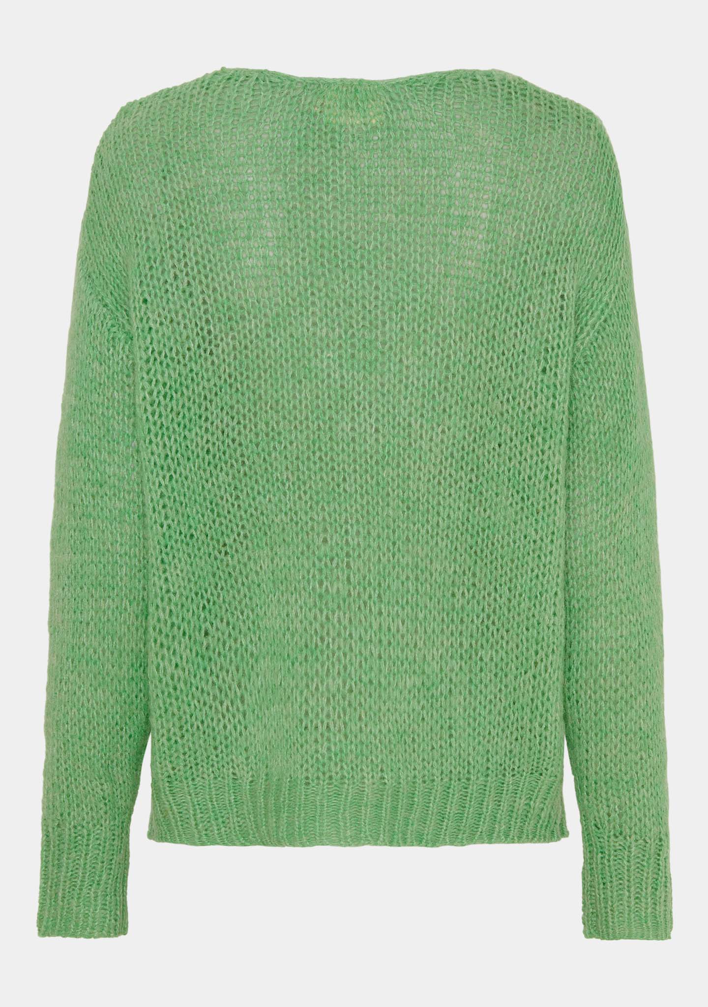 Lækker let strikket sweater fra ISAY. Sweateren er støvet grøn, med v-udskæring og en normal pasform. Strikken fåes i flere farver. Strikken har rib afslutninger ved kanterne.